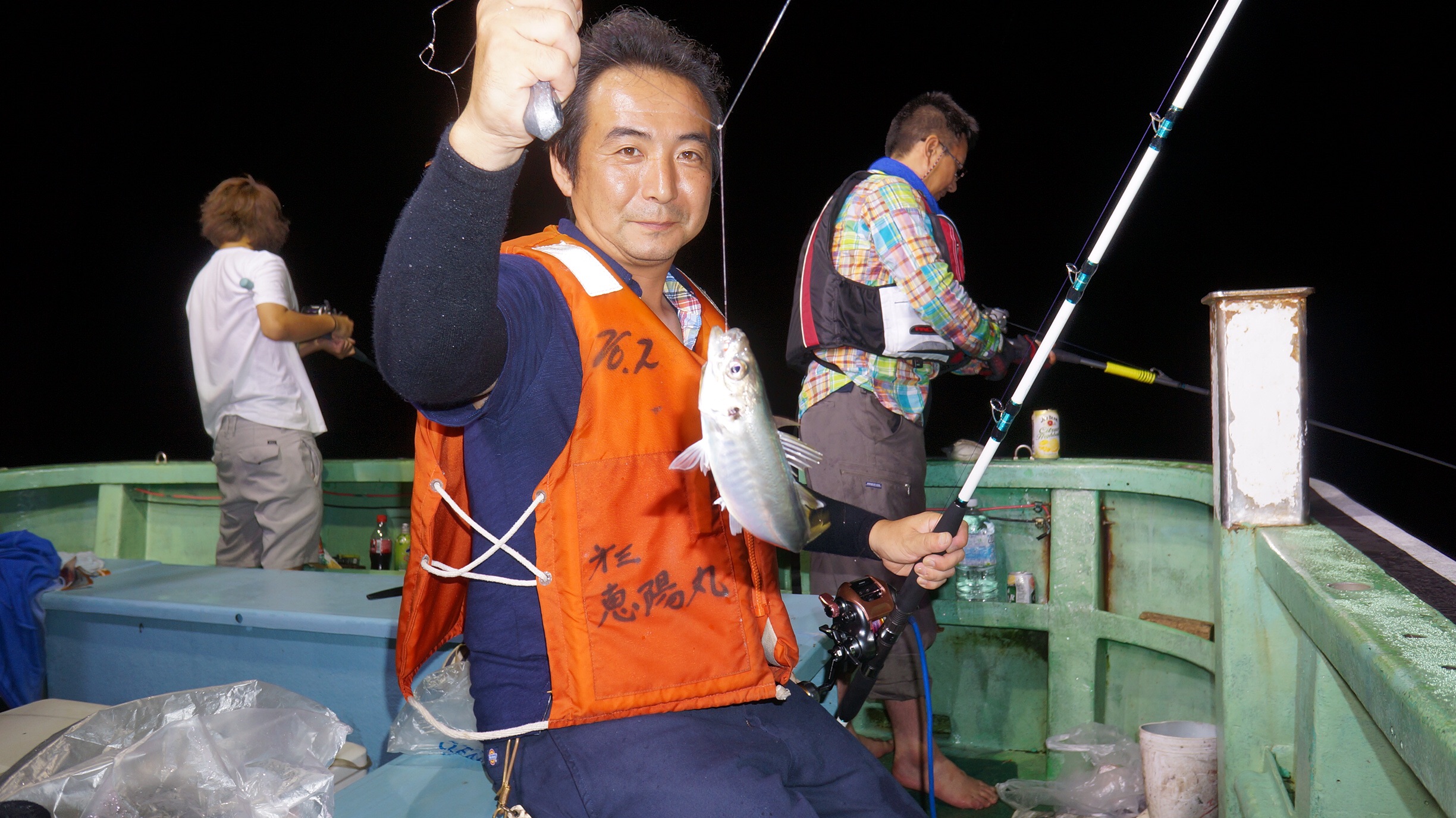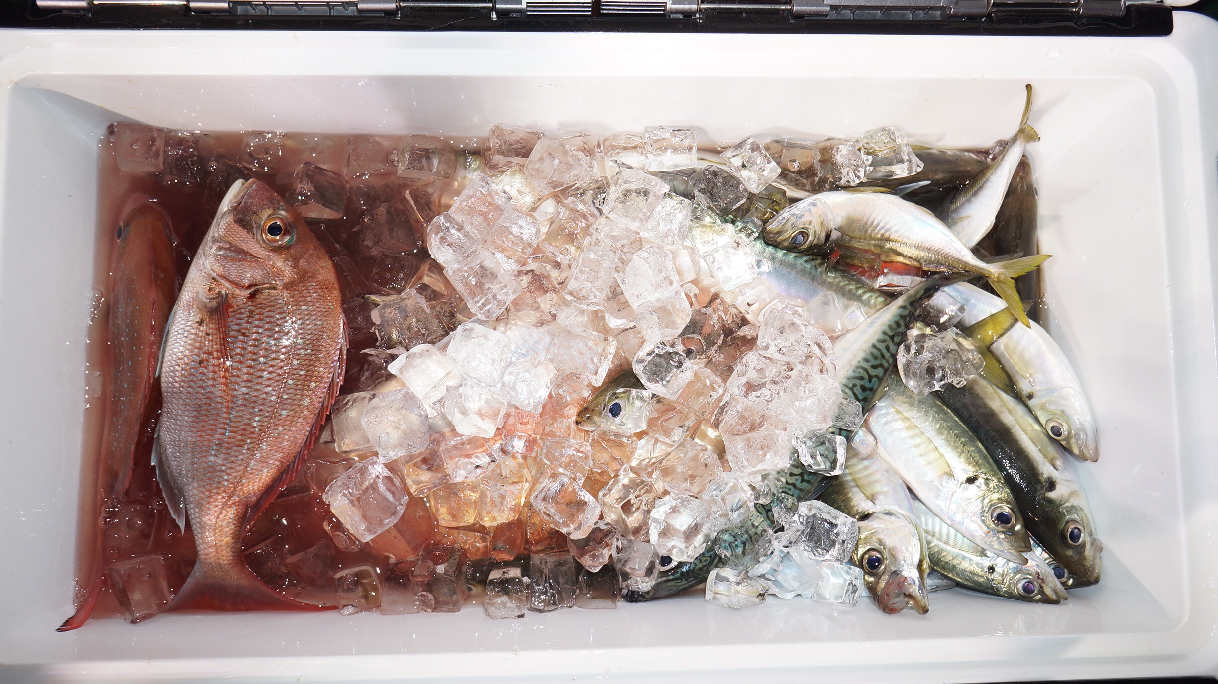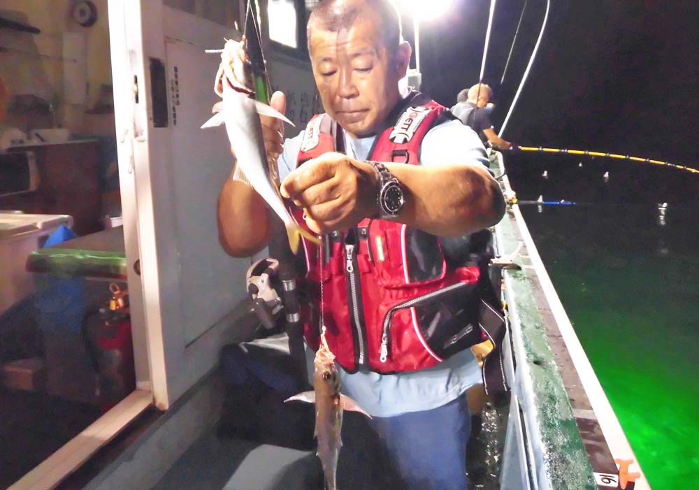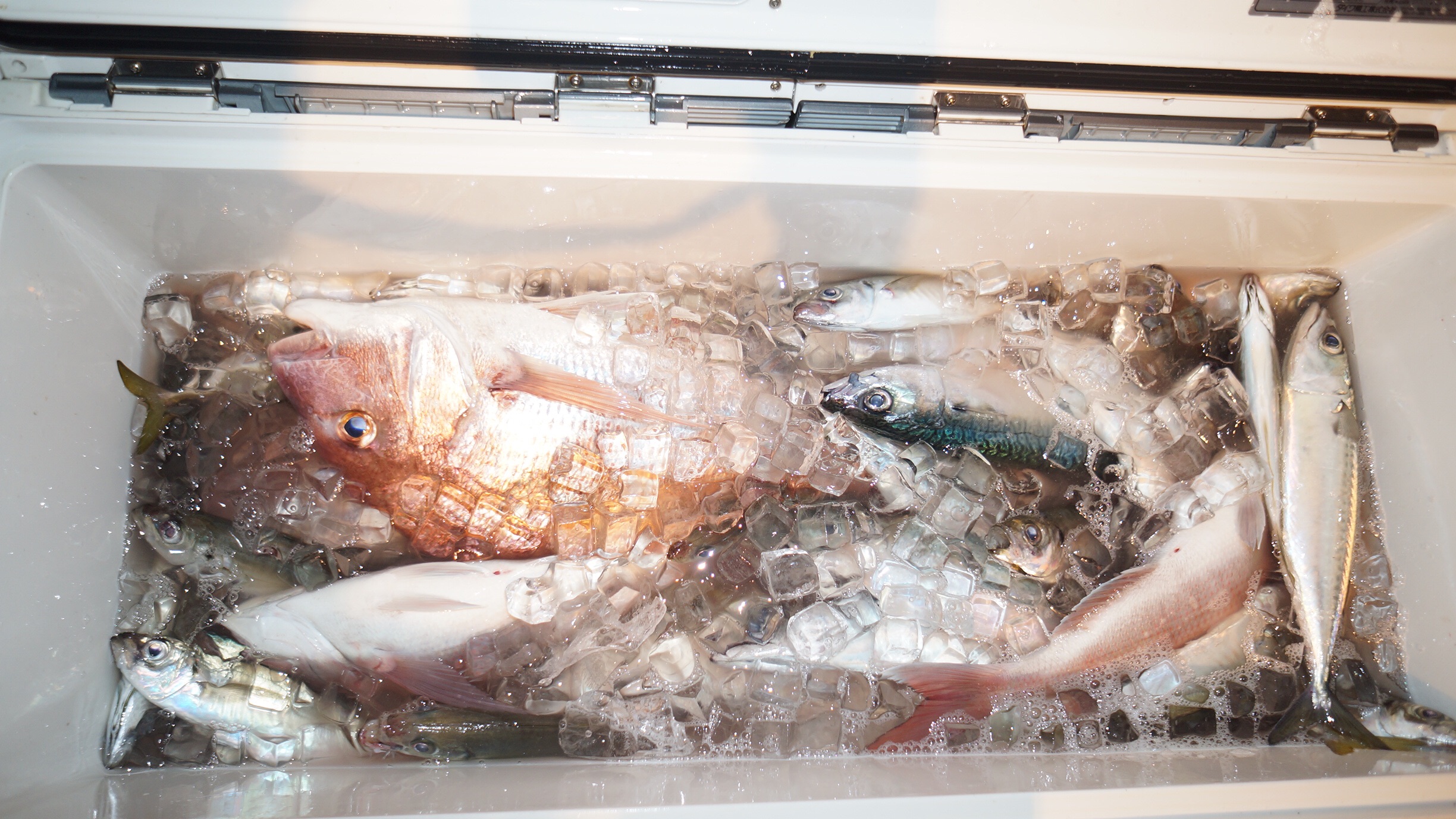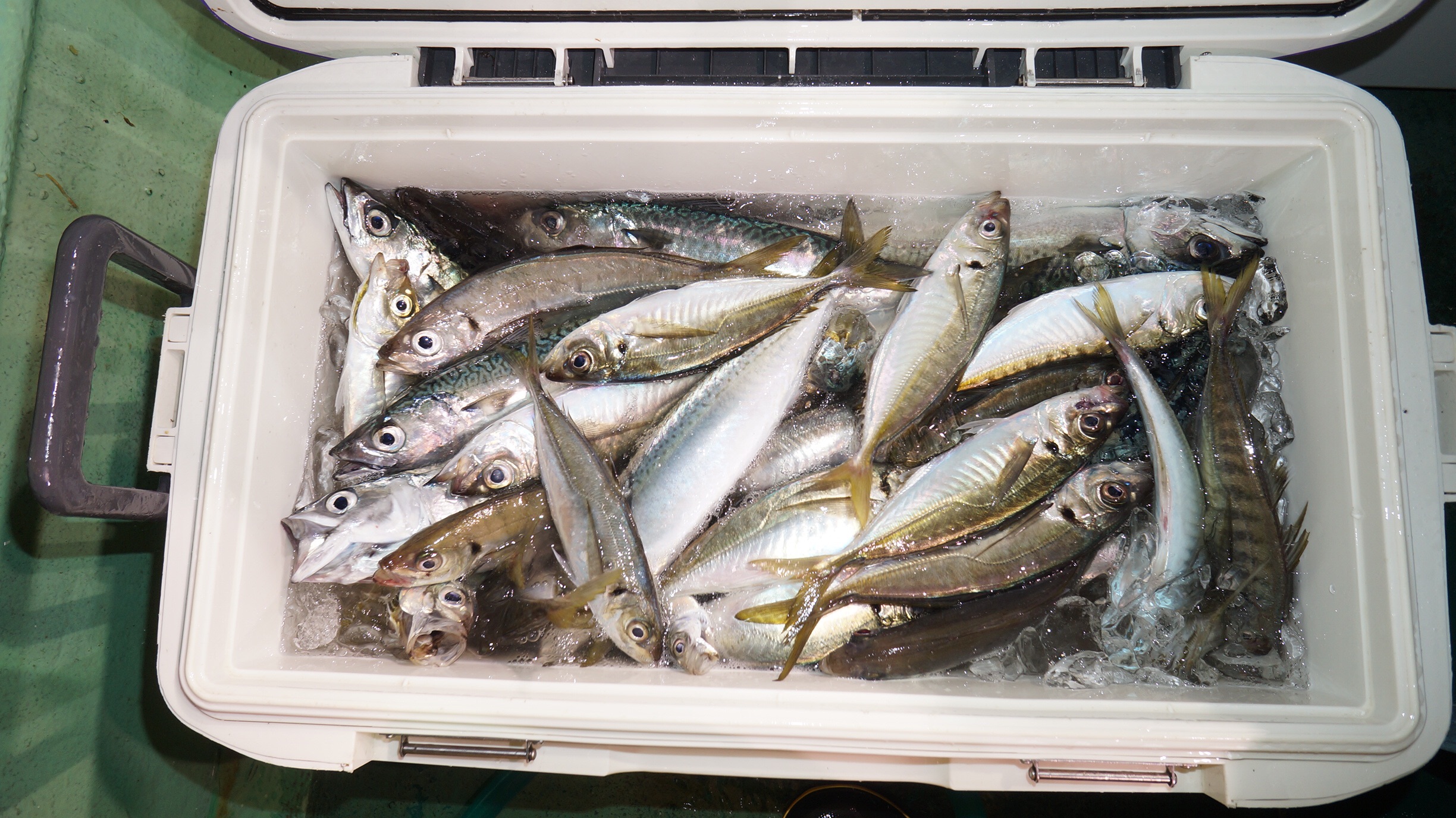 お盆前にしては北風が吹き、夜にうねりがのこり、少し船に揺れがありました。潮の流れもなく、船が移動せず苦戦しましました。アジ、さば、真ダイ、イシモチなど混ざりの釣果になりました。