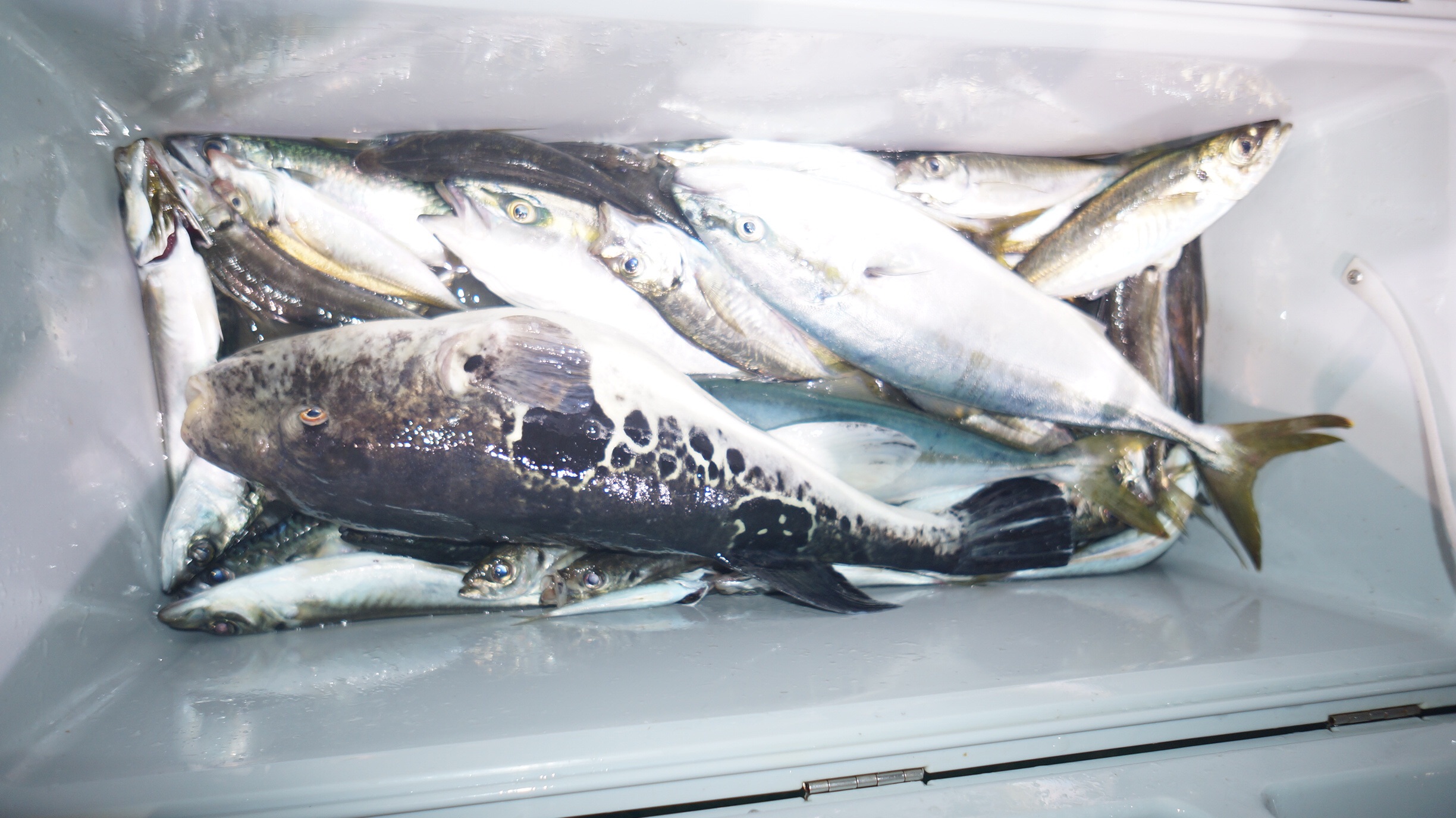 本日海上穏やか魚影良くアジ入れ食いしました、他スズキ、イナダ、ワラサ、マダイ、トラフグ