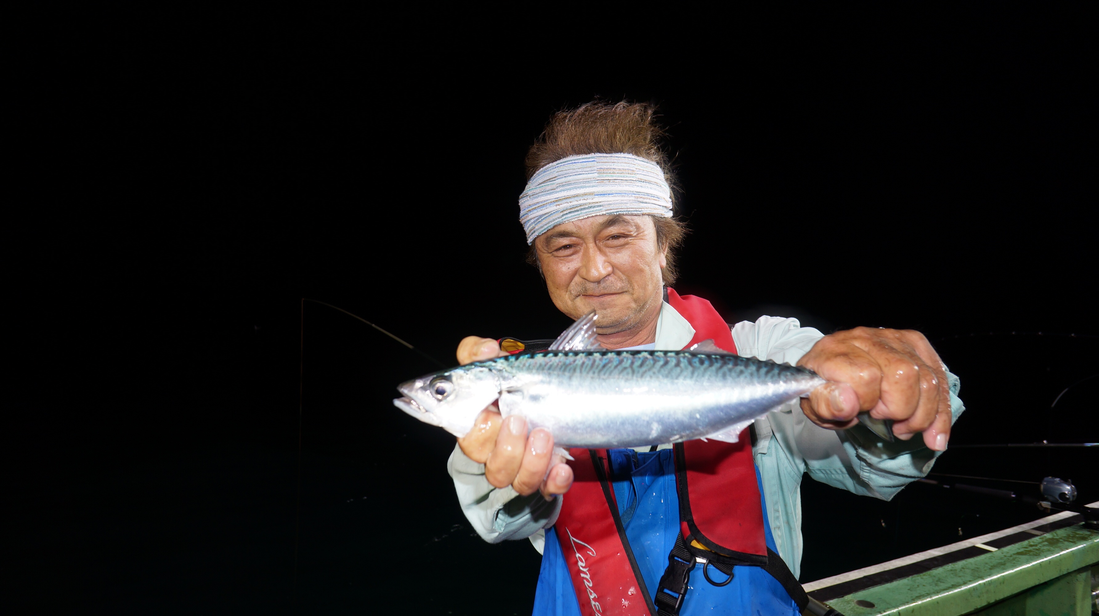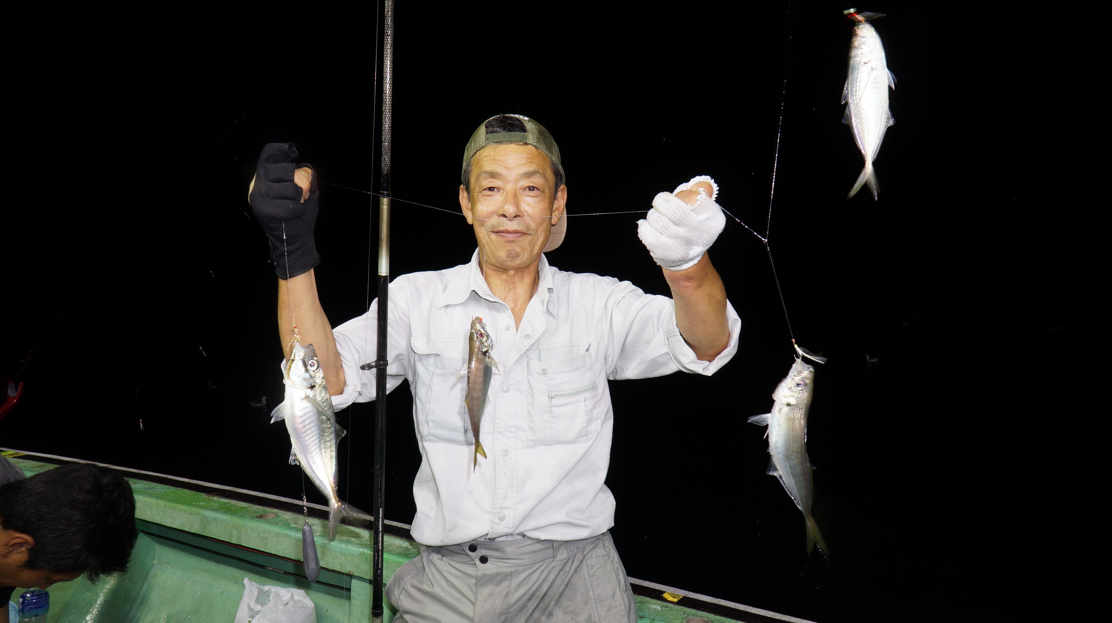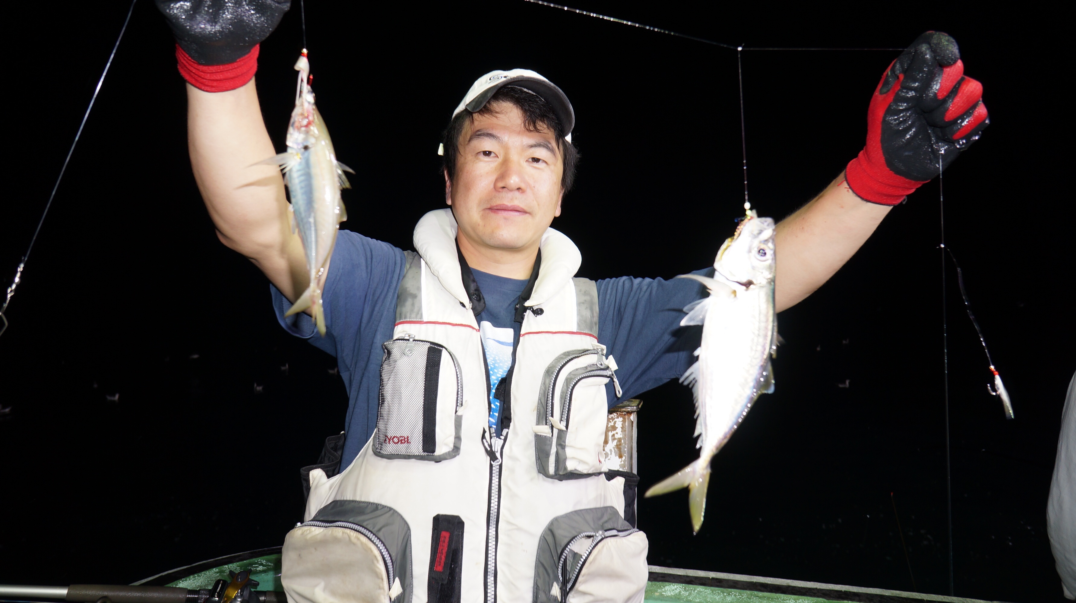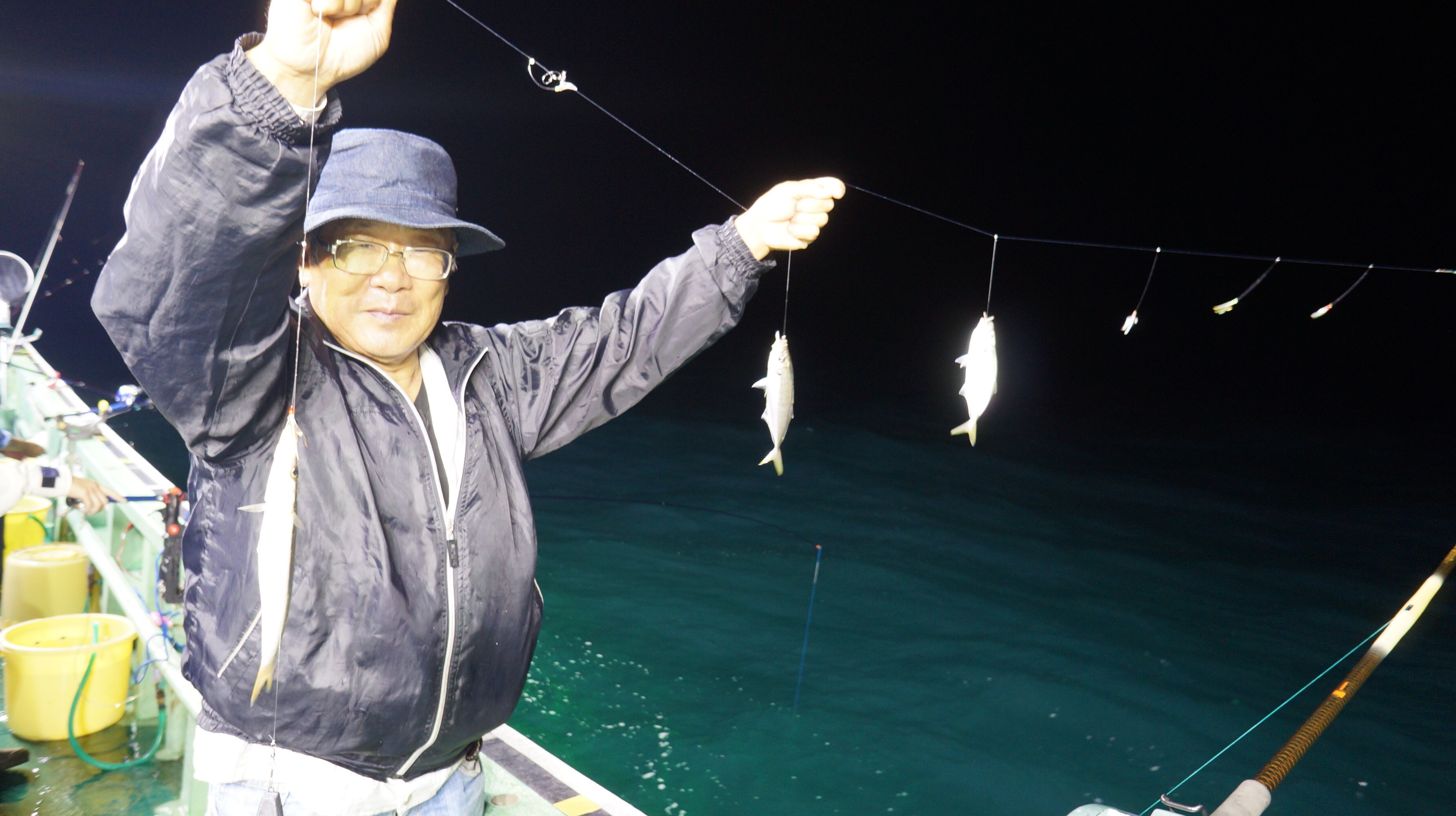 本日流れ少し早かつたが、魚影良く灯り点灯時より、アジ、大サバ、フクラゲ、マダイ、