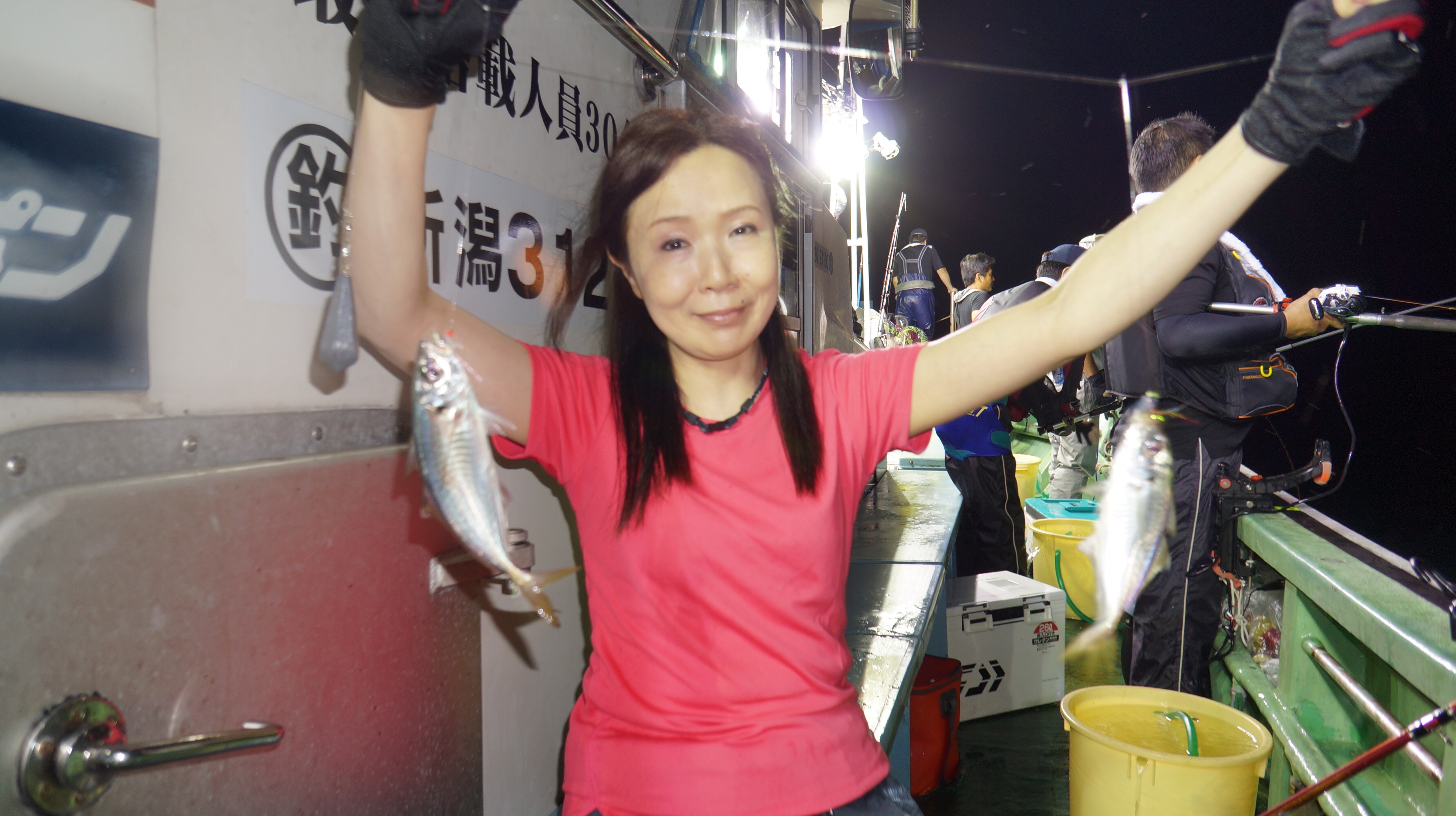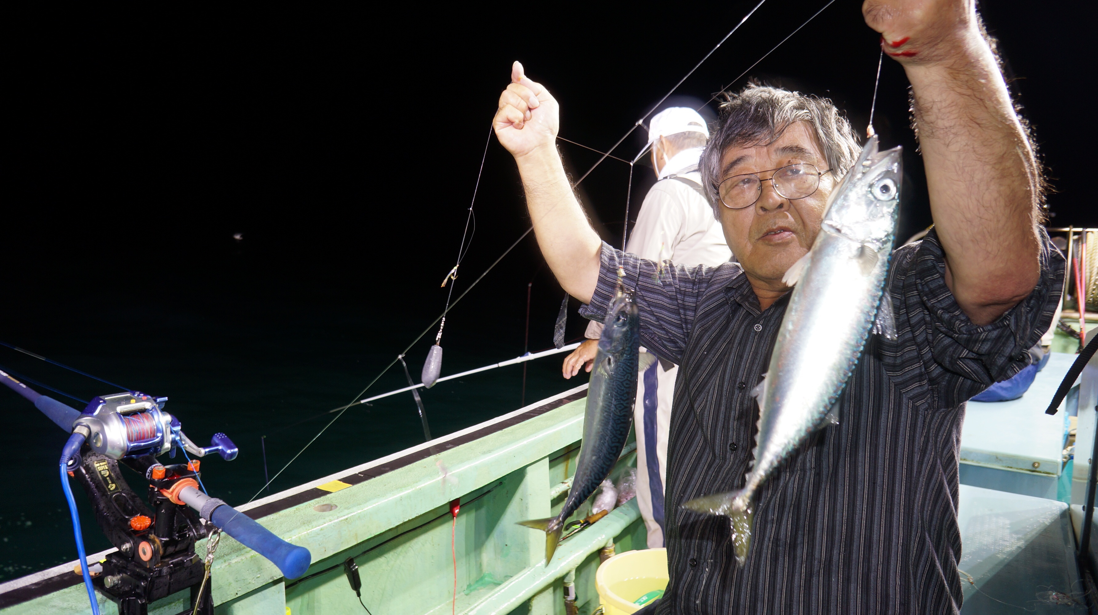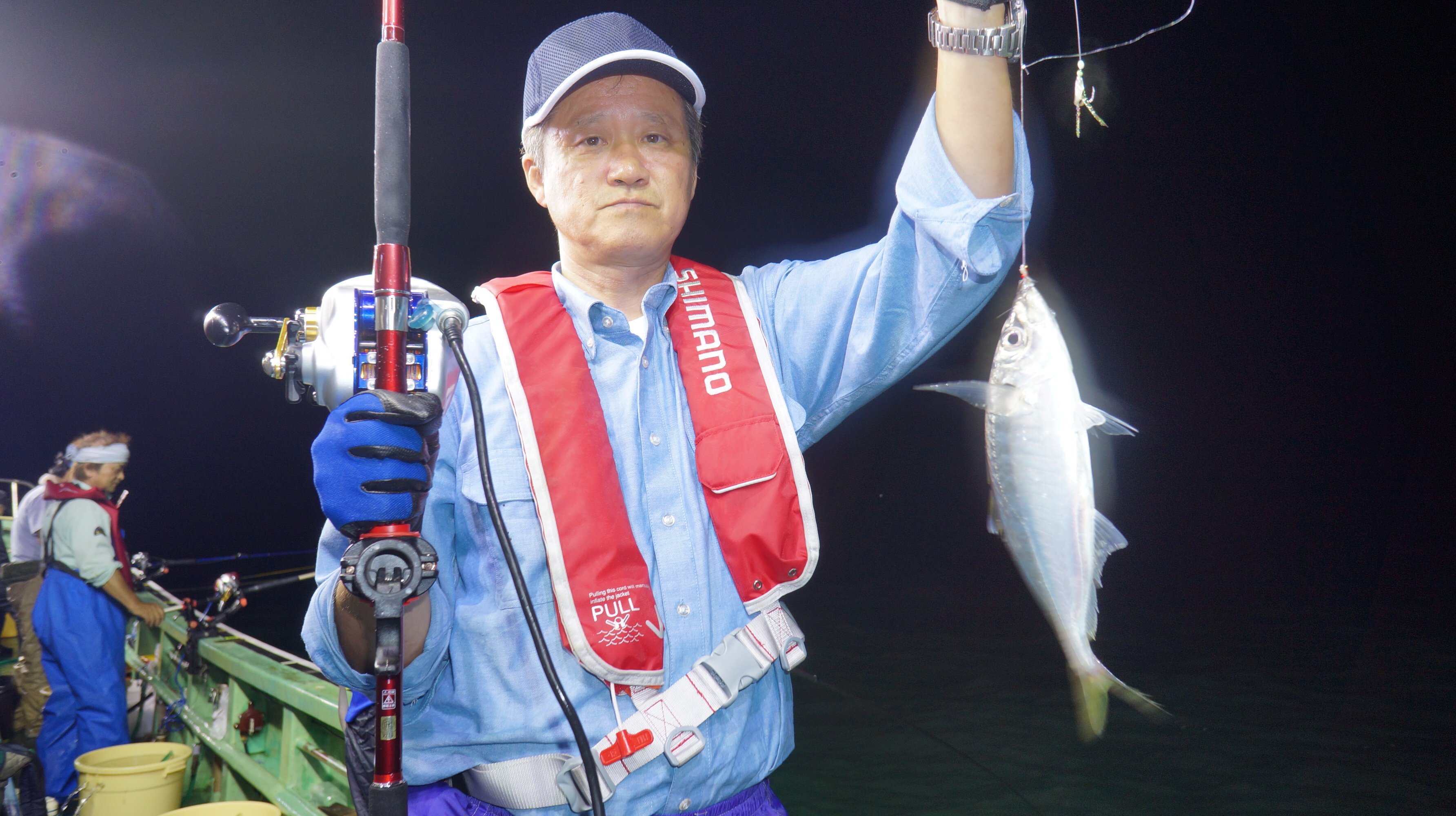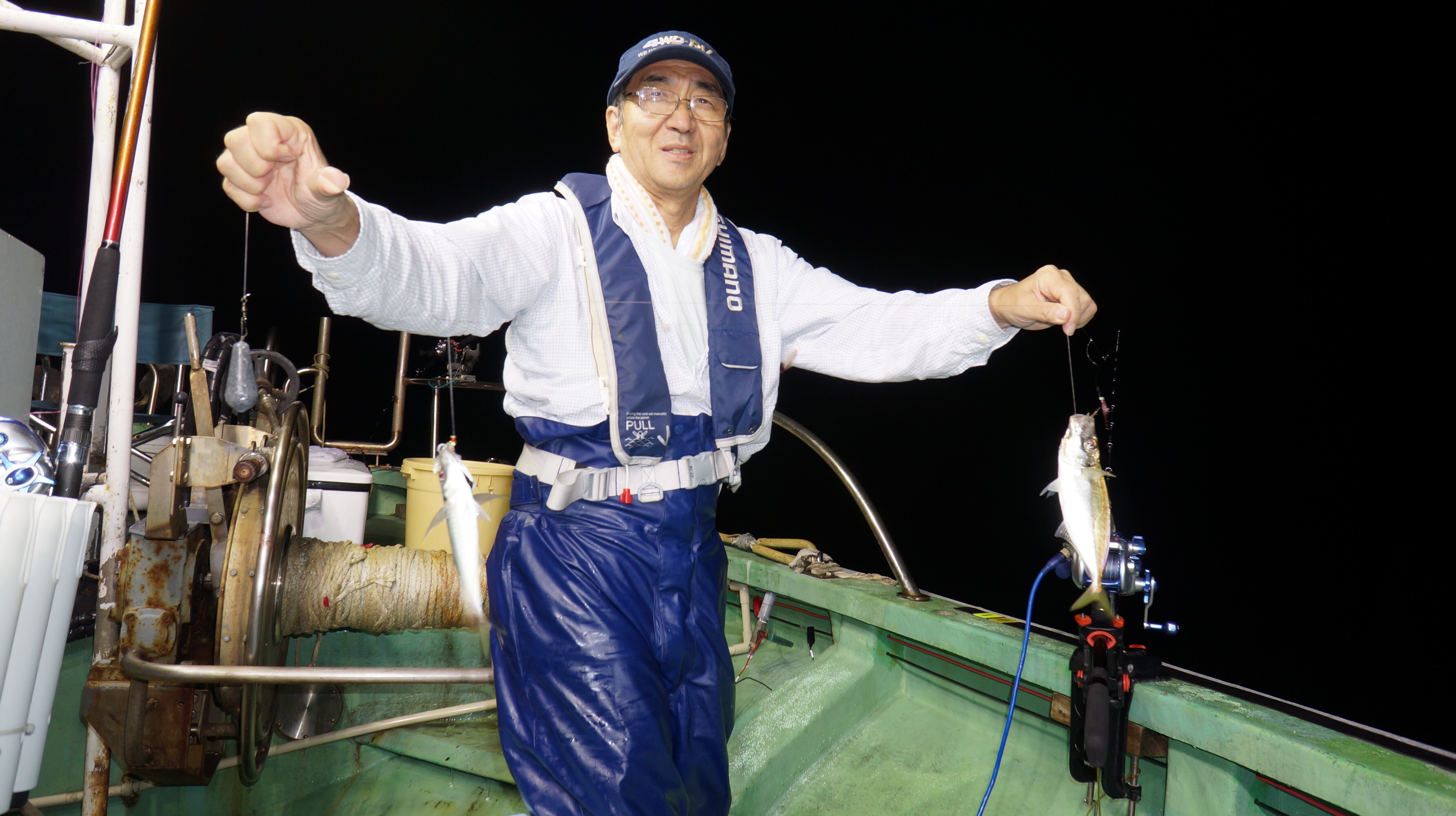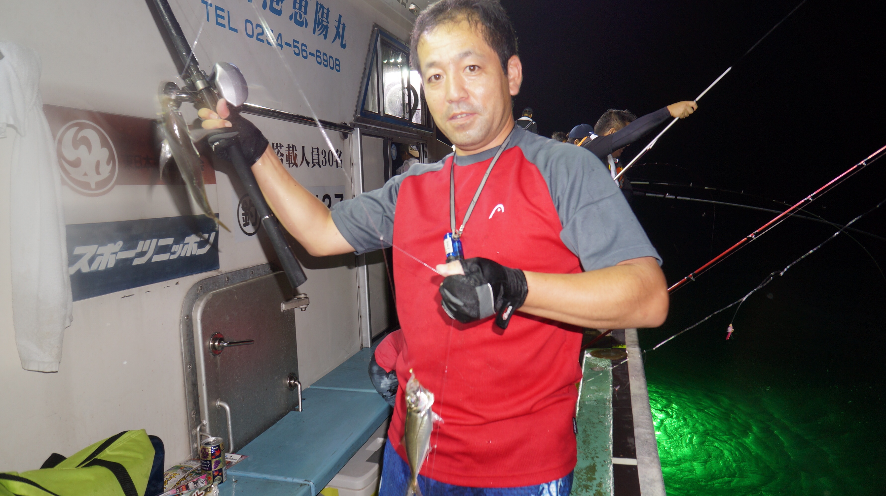 本日流れ少し早かつたが、魚影良く灯り点灯時より、アジ、大サバ、フクラゲ、マダイ、