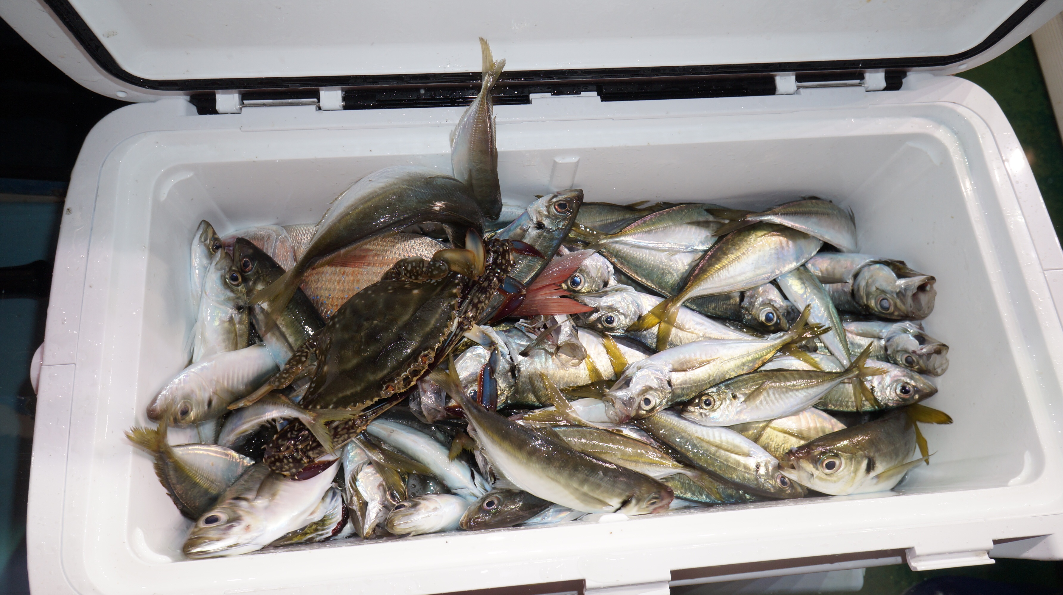 本日貸切船、海上穏やかで、魚影良くアジ入れ食い瀑釣しました。他マダイ、ワラサ、サバ、ワタリカニ多数匹。