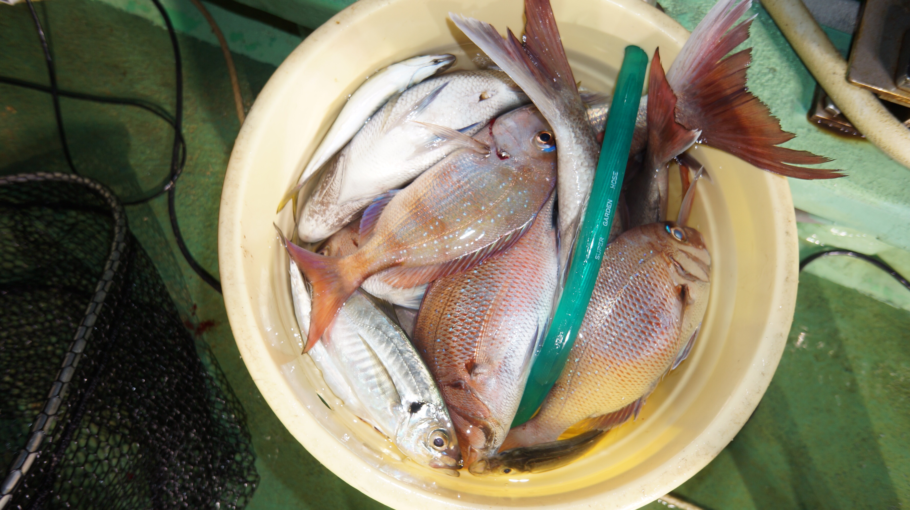 本日海上穏やか流れ良く、アジ、マダイ、イナダ、ヒラメ、サバ、釣れました。マダイ有望、御予約お待ちしております。