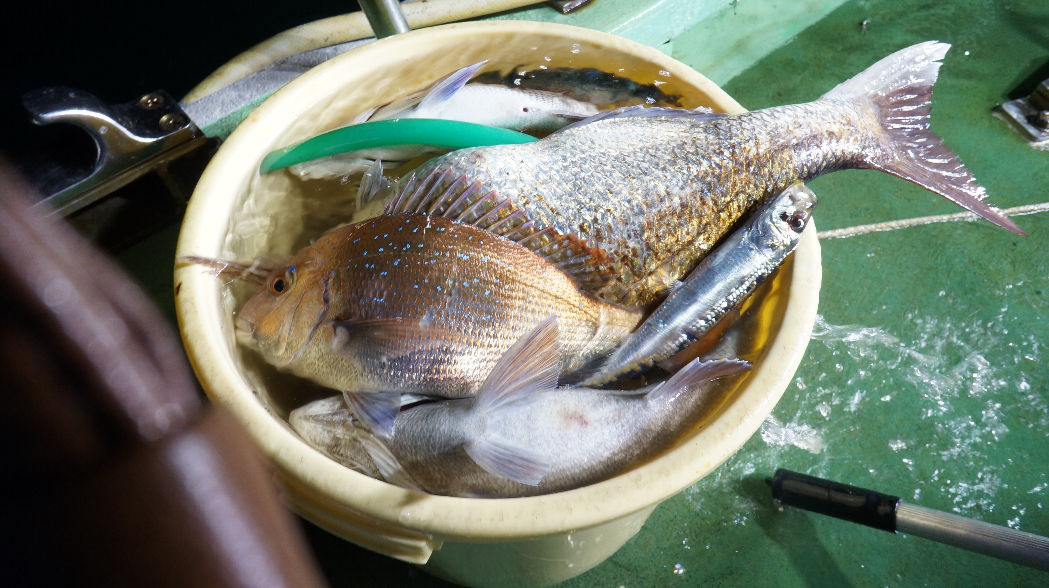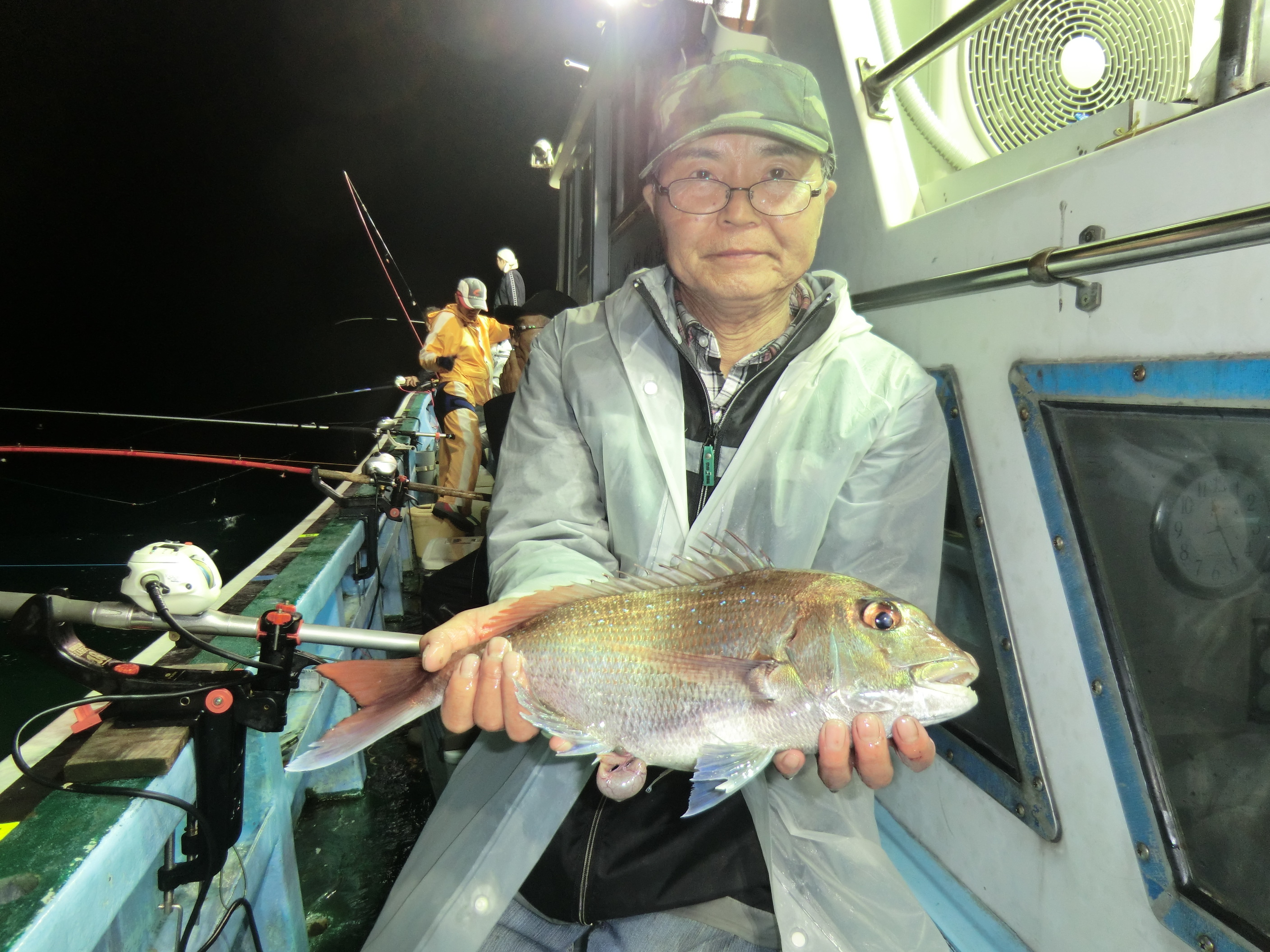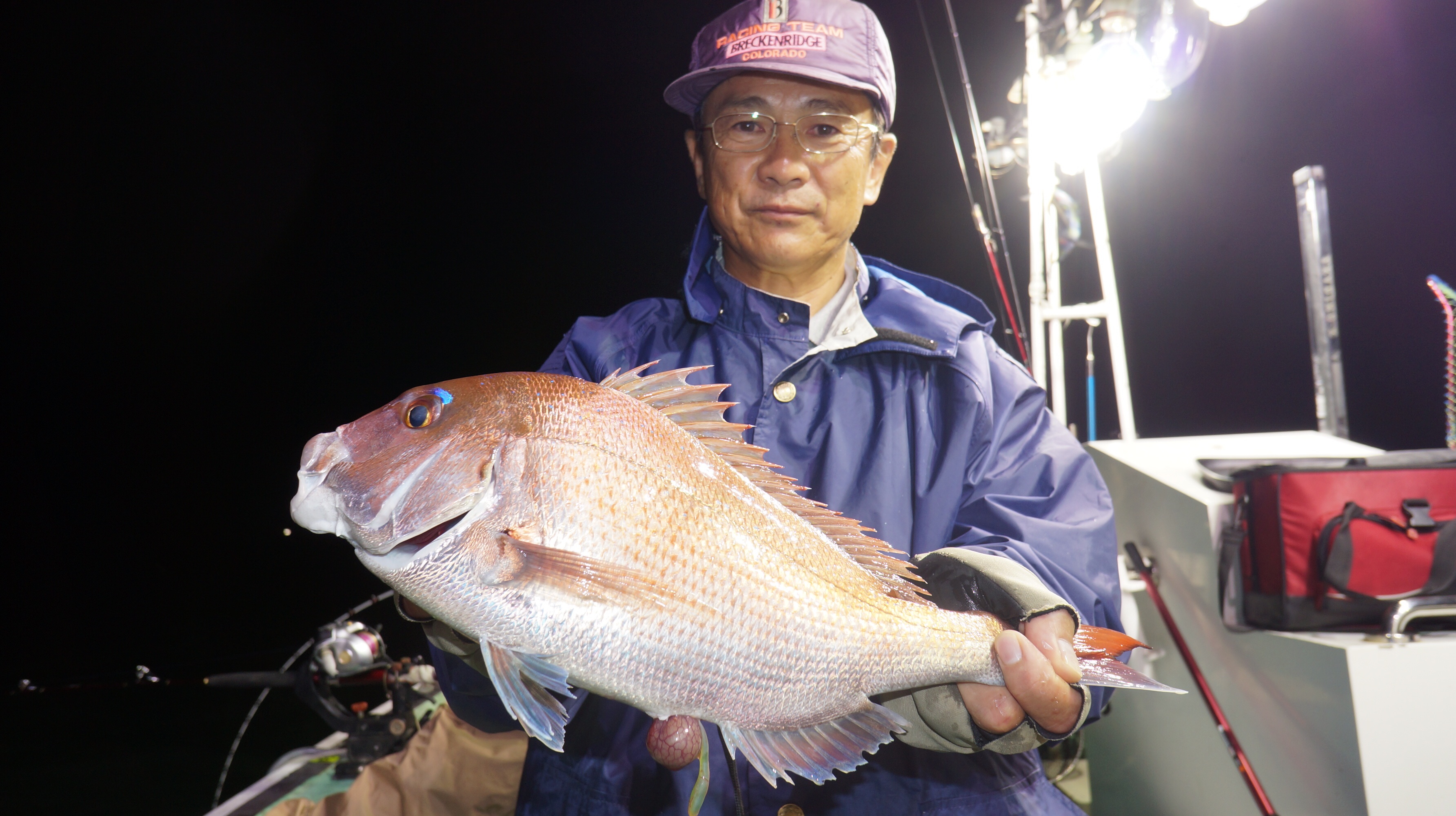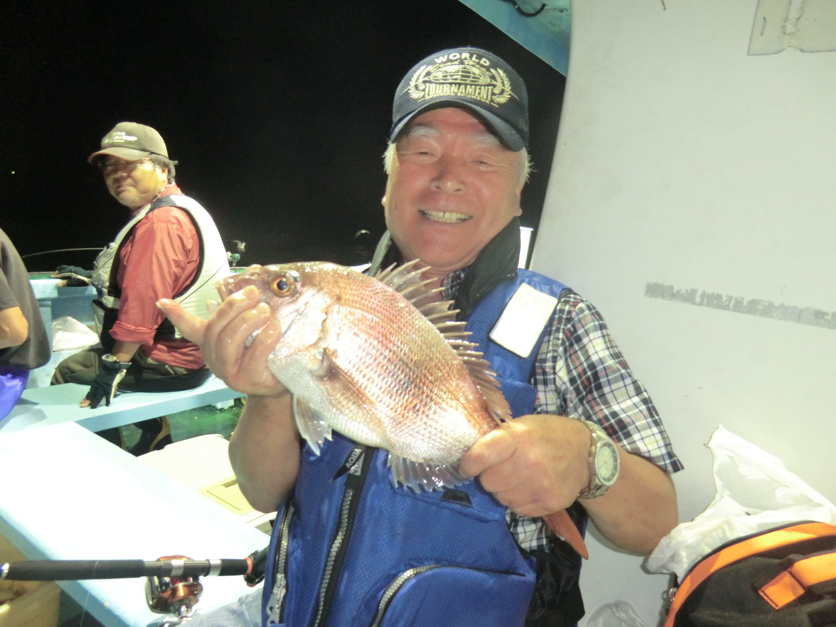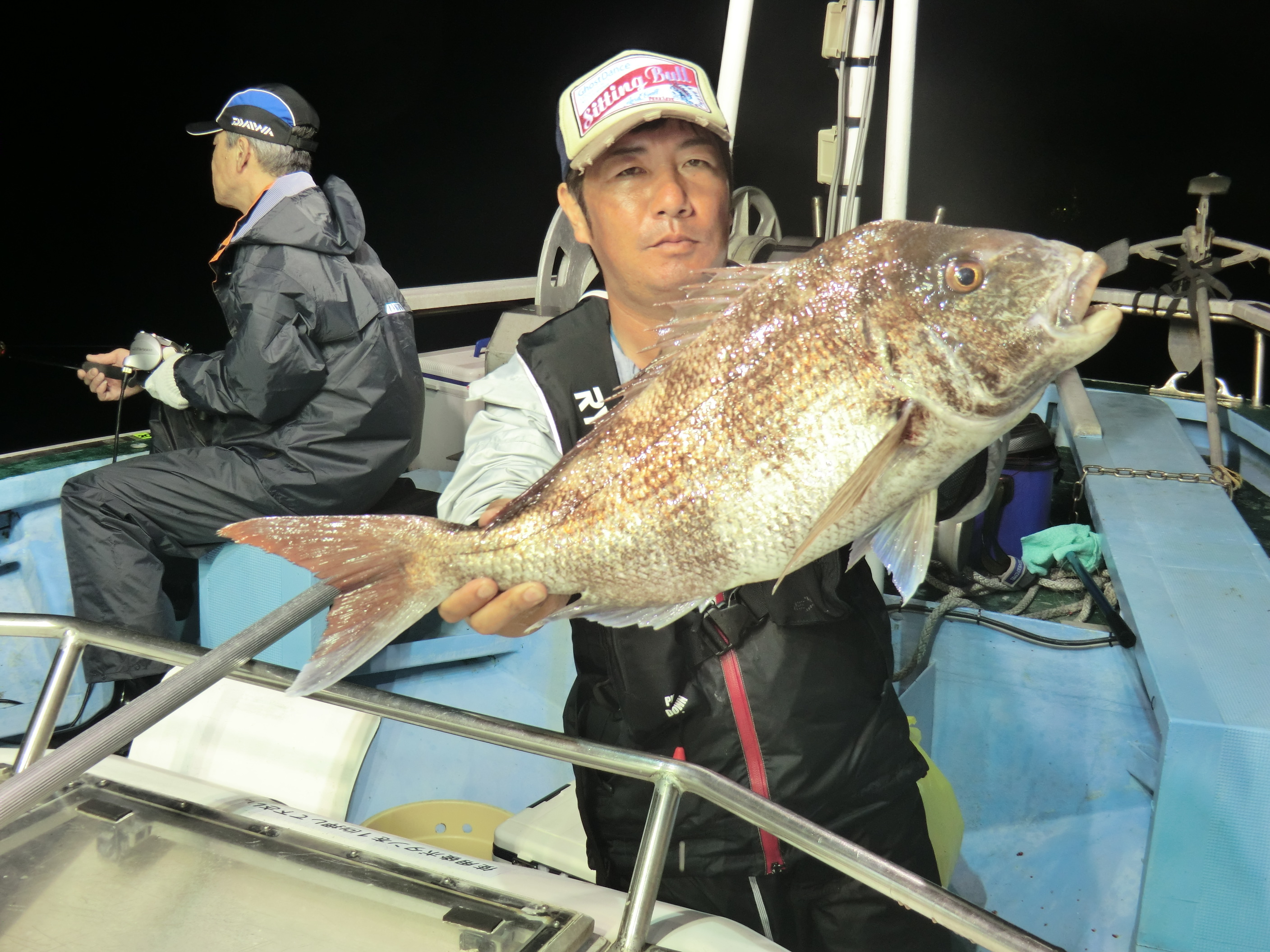 流れ、魚影良くアジ入れ食い、マダイ0.8〜4.8k船中38匹、スズキ3匹.他イナダ