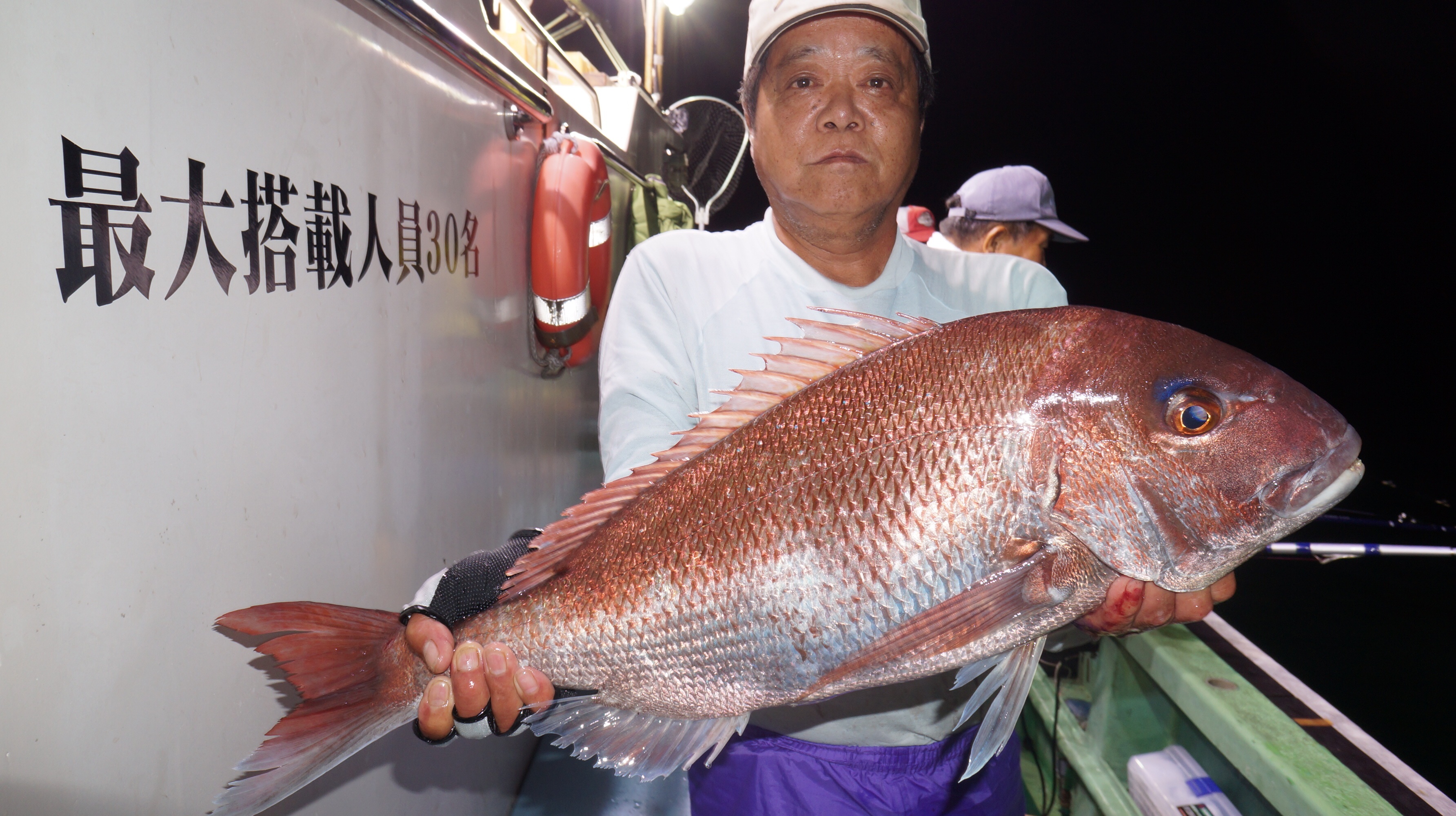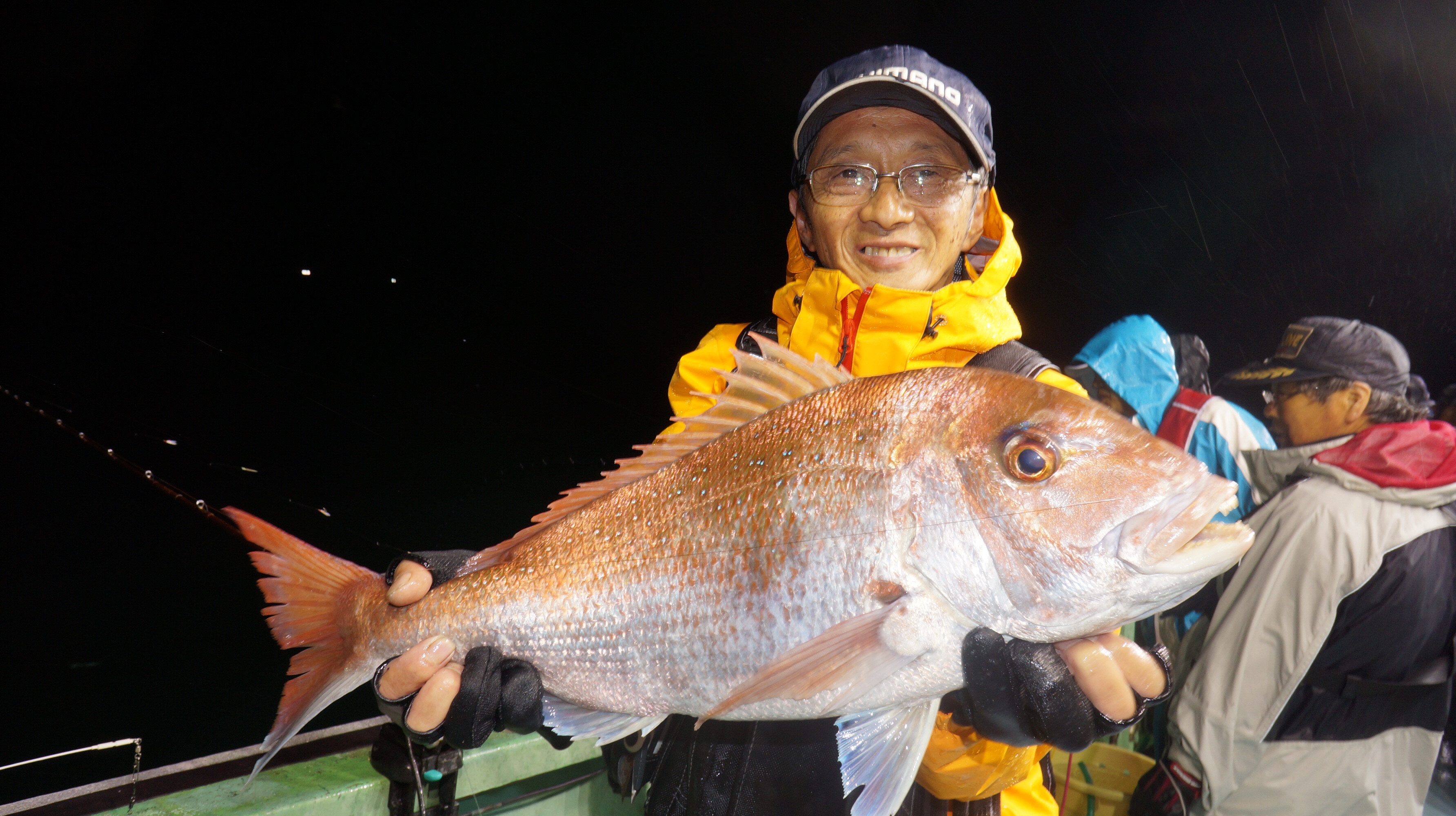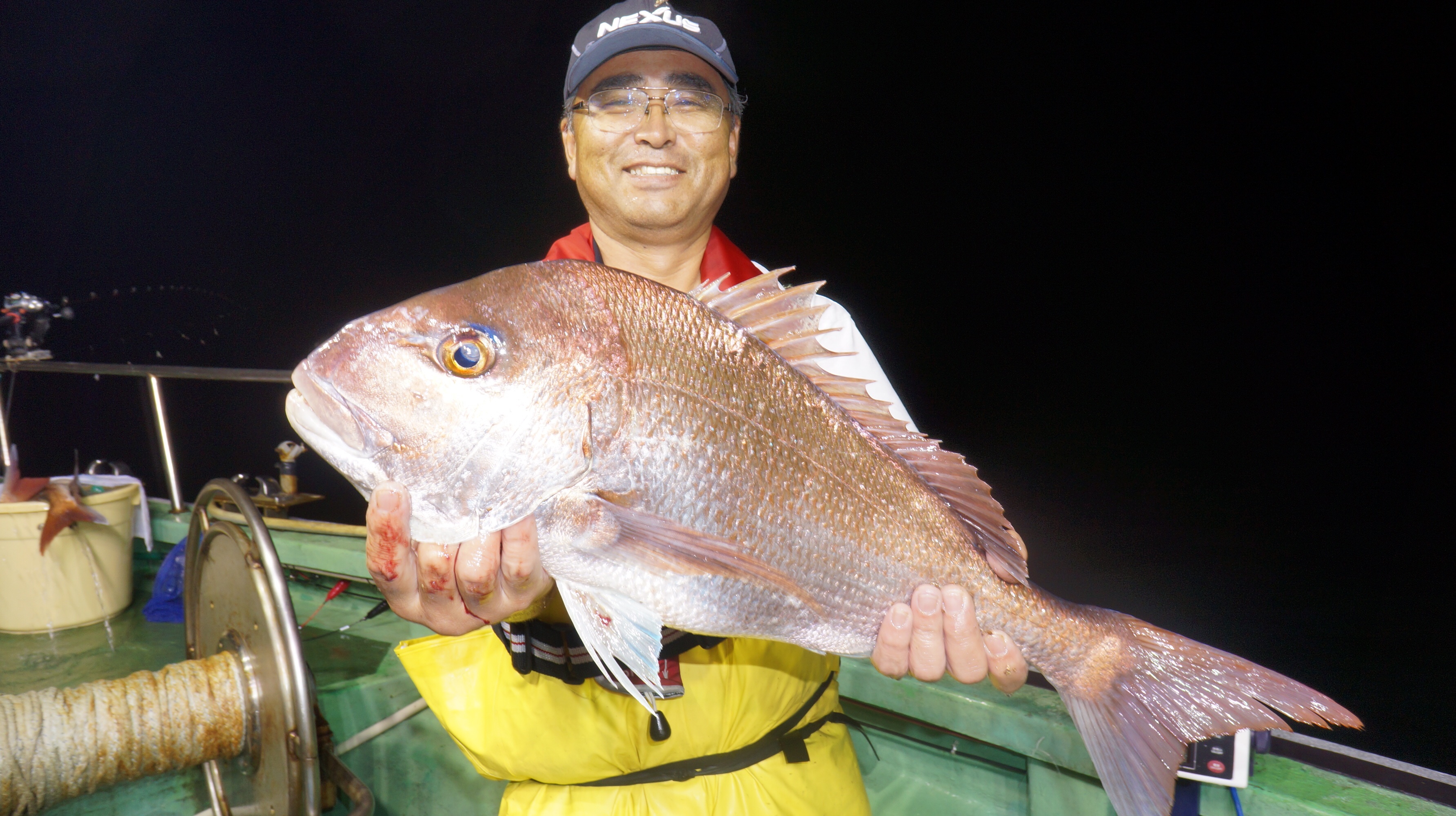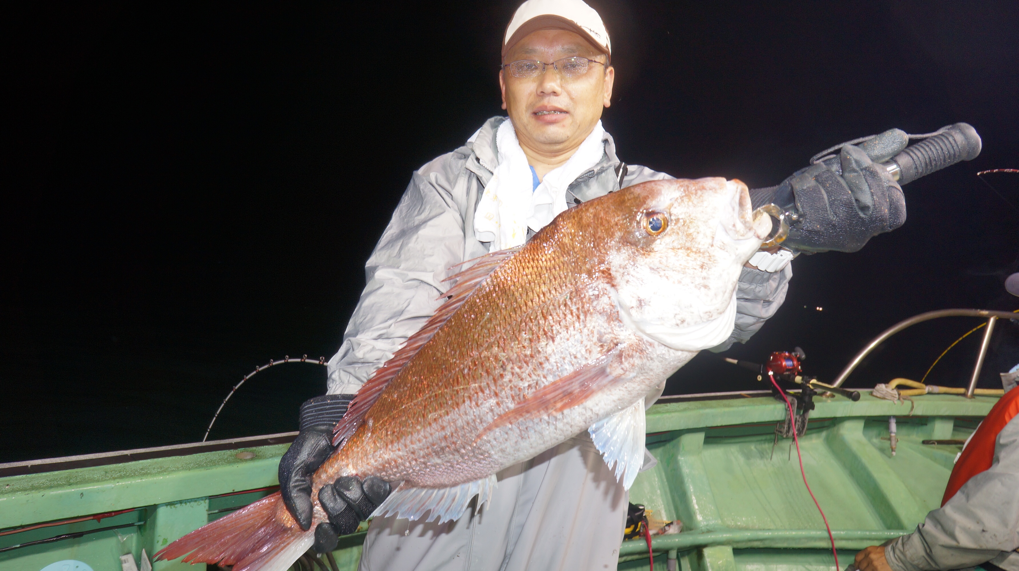 流れ、魚影良くアジ入れ食い、マダイ0.8〜4.8k船中38匹、スズキ3匹.他イナダ