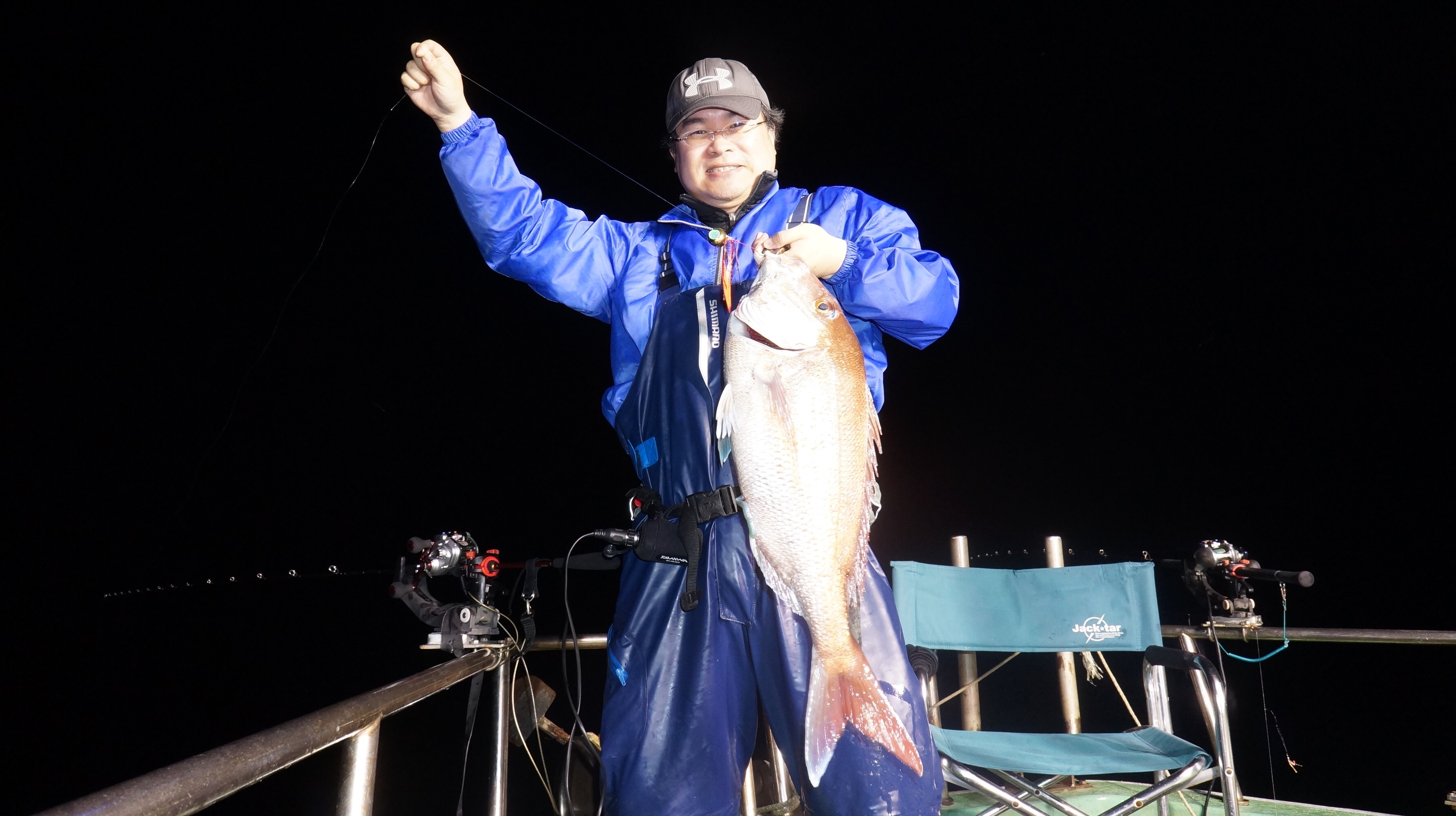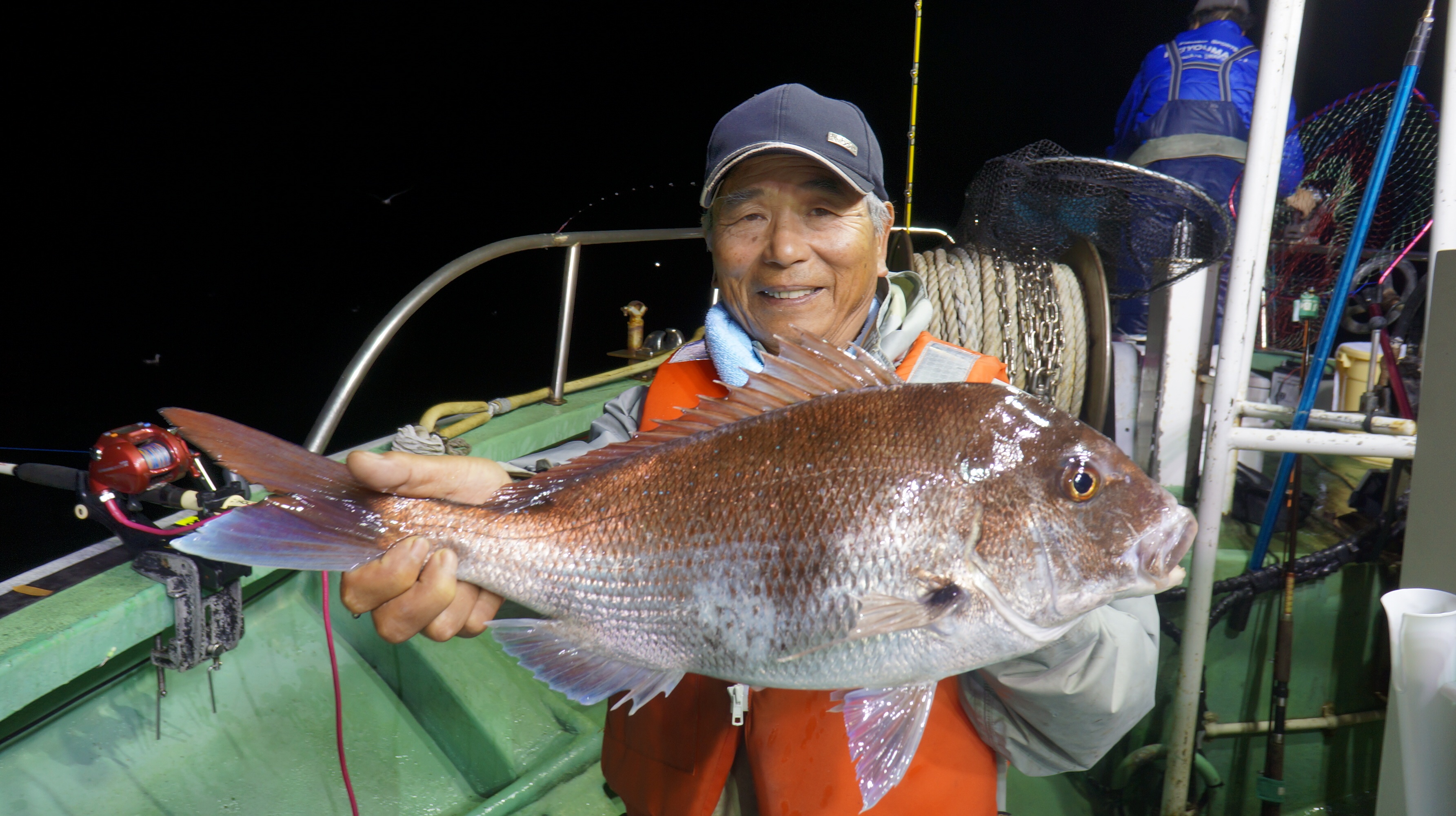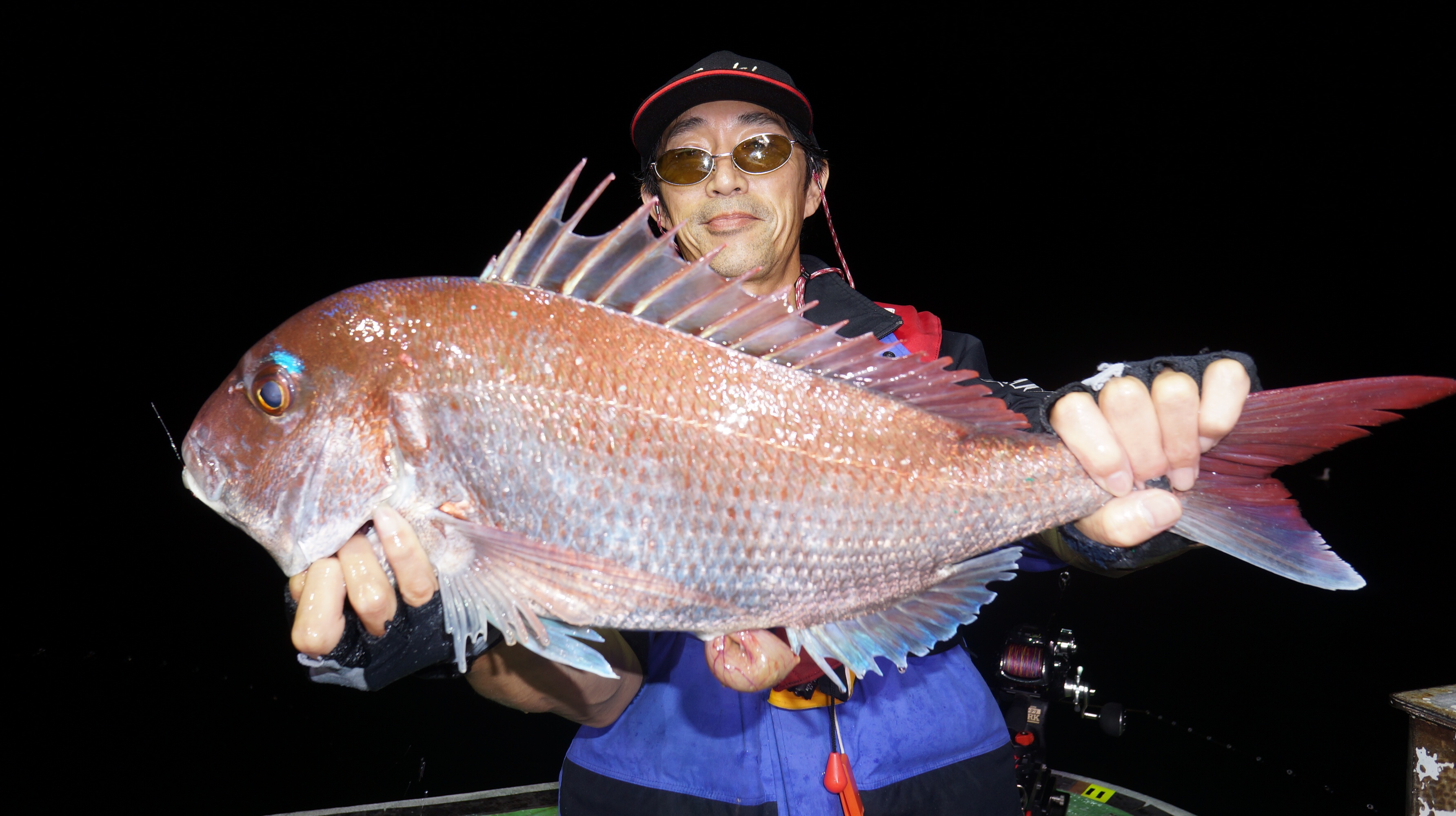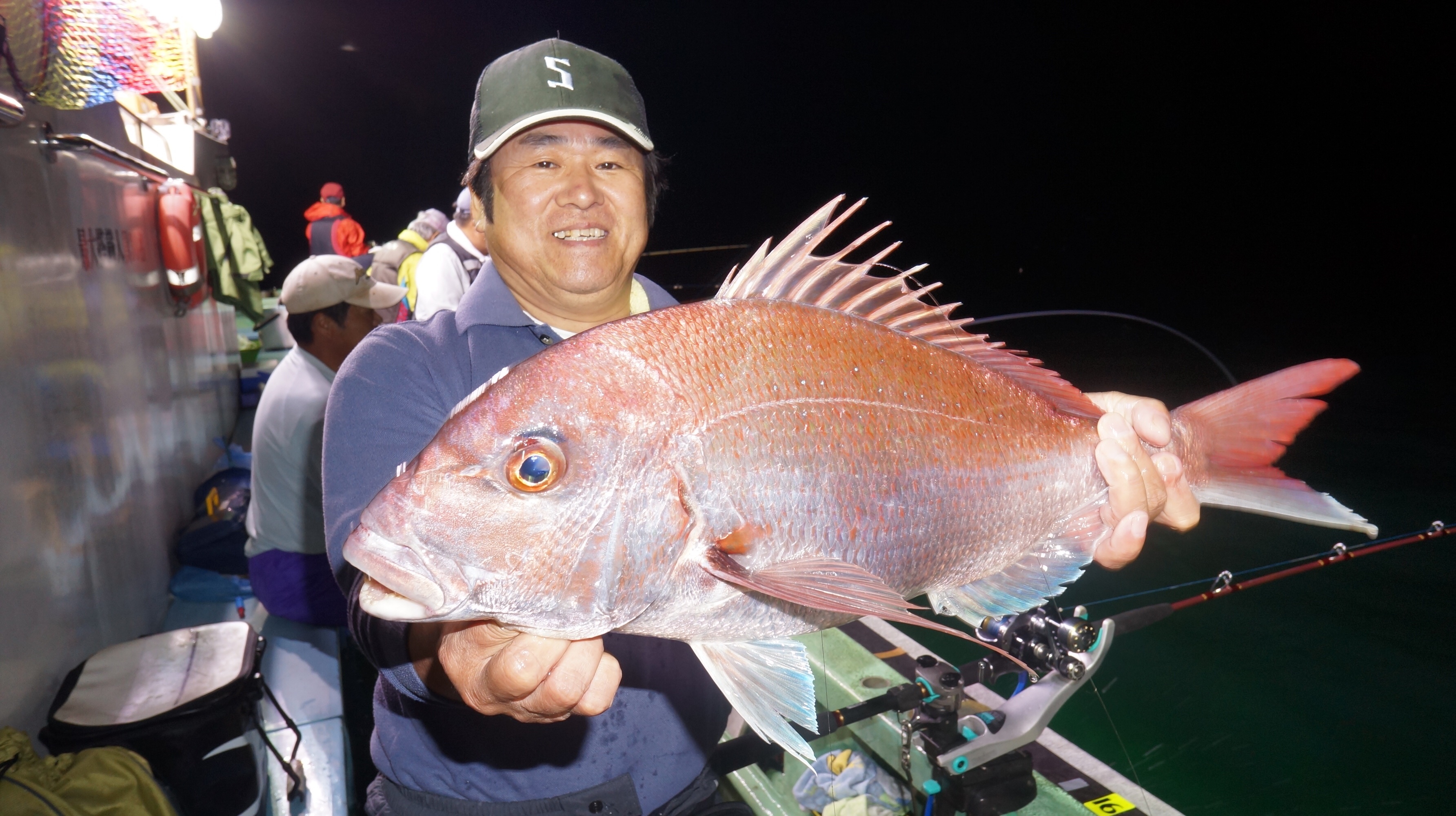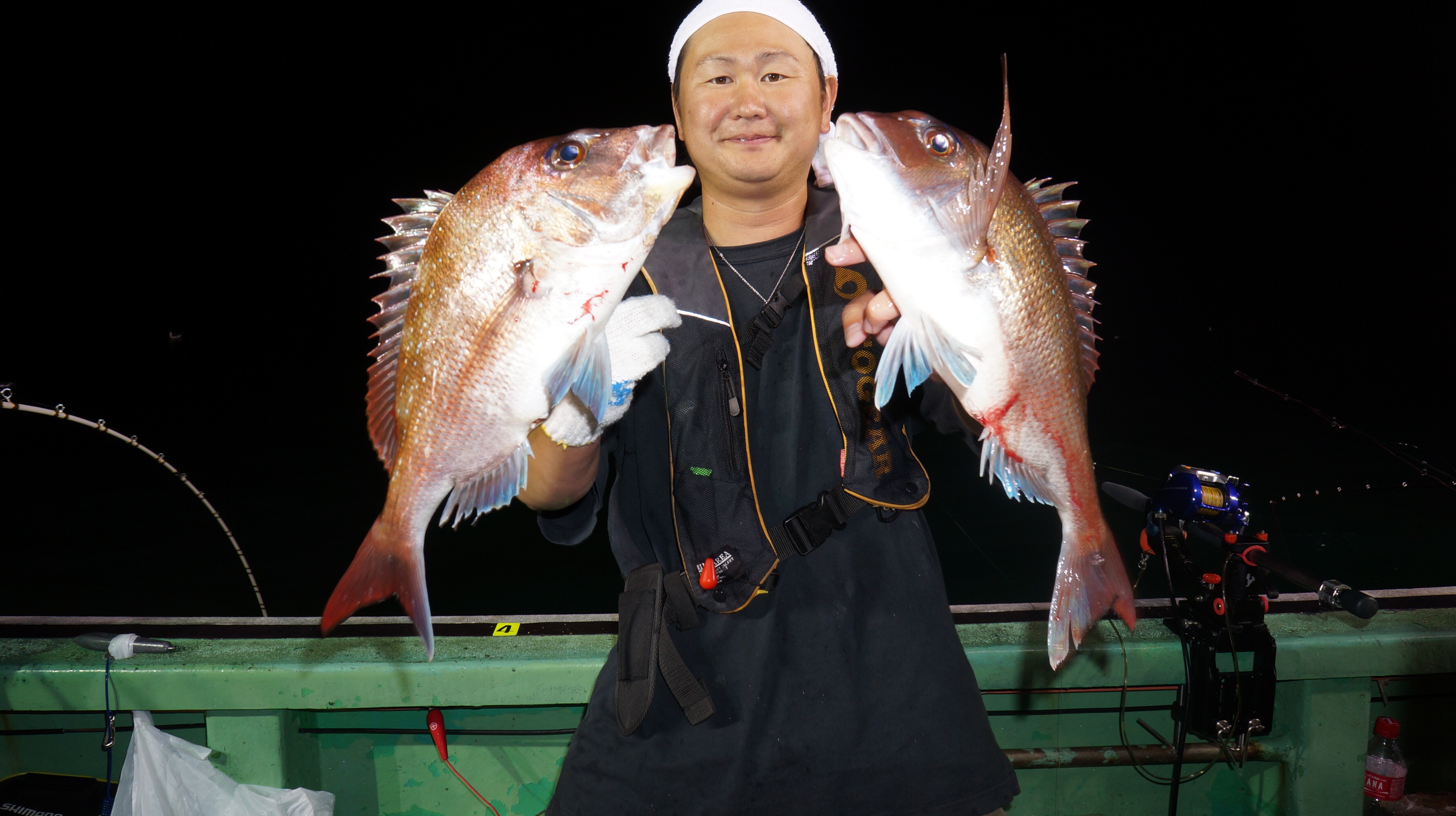 流れ、魚影良くアジ入れ食い、マダイ0.8〜4.8k船中38匹、スズキ3匹.他イナダ