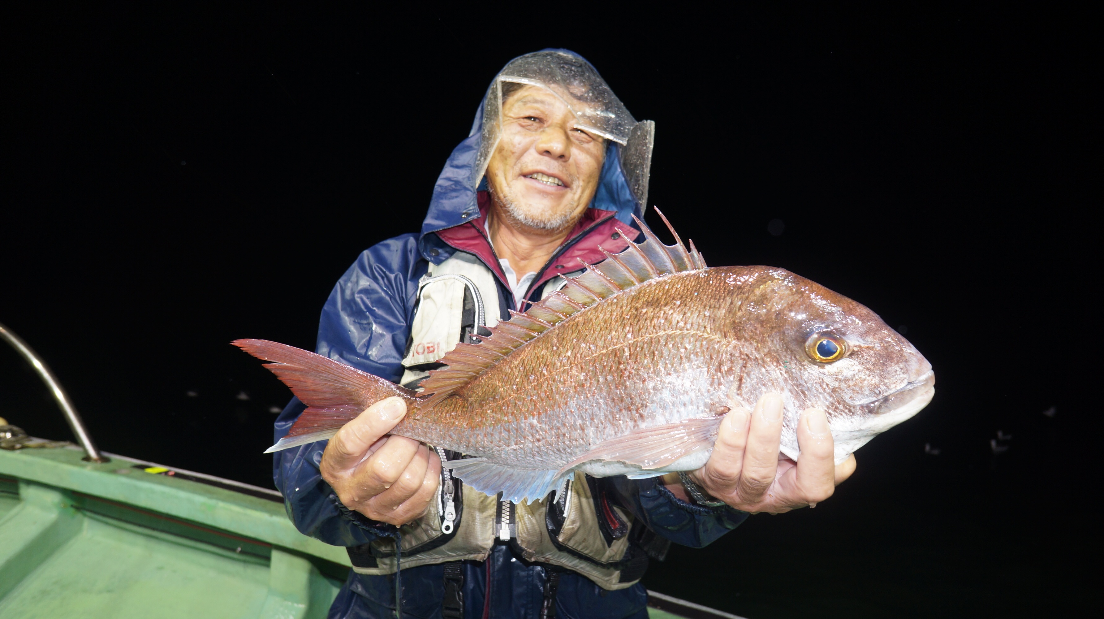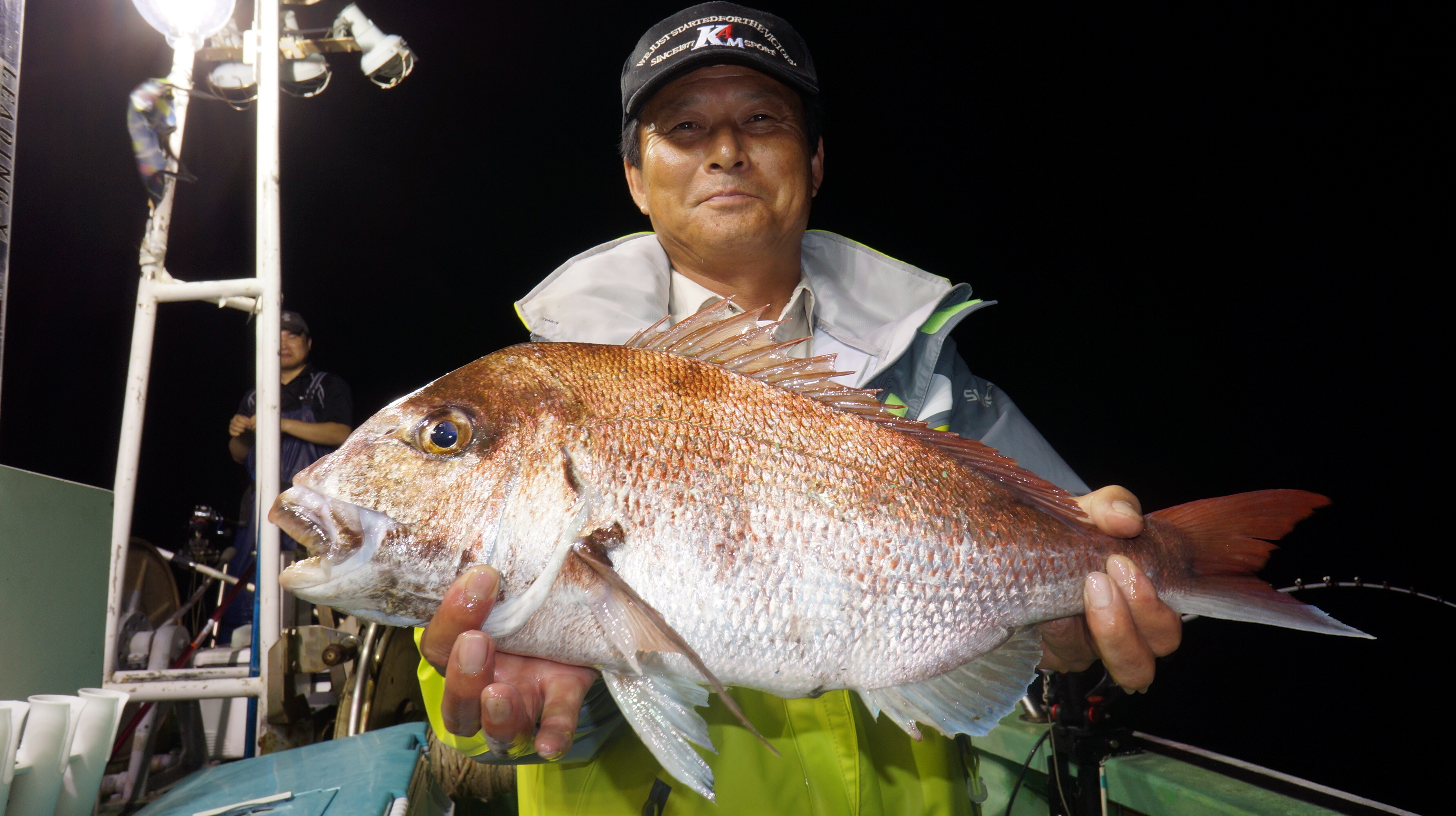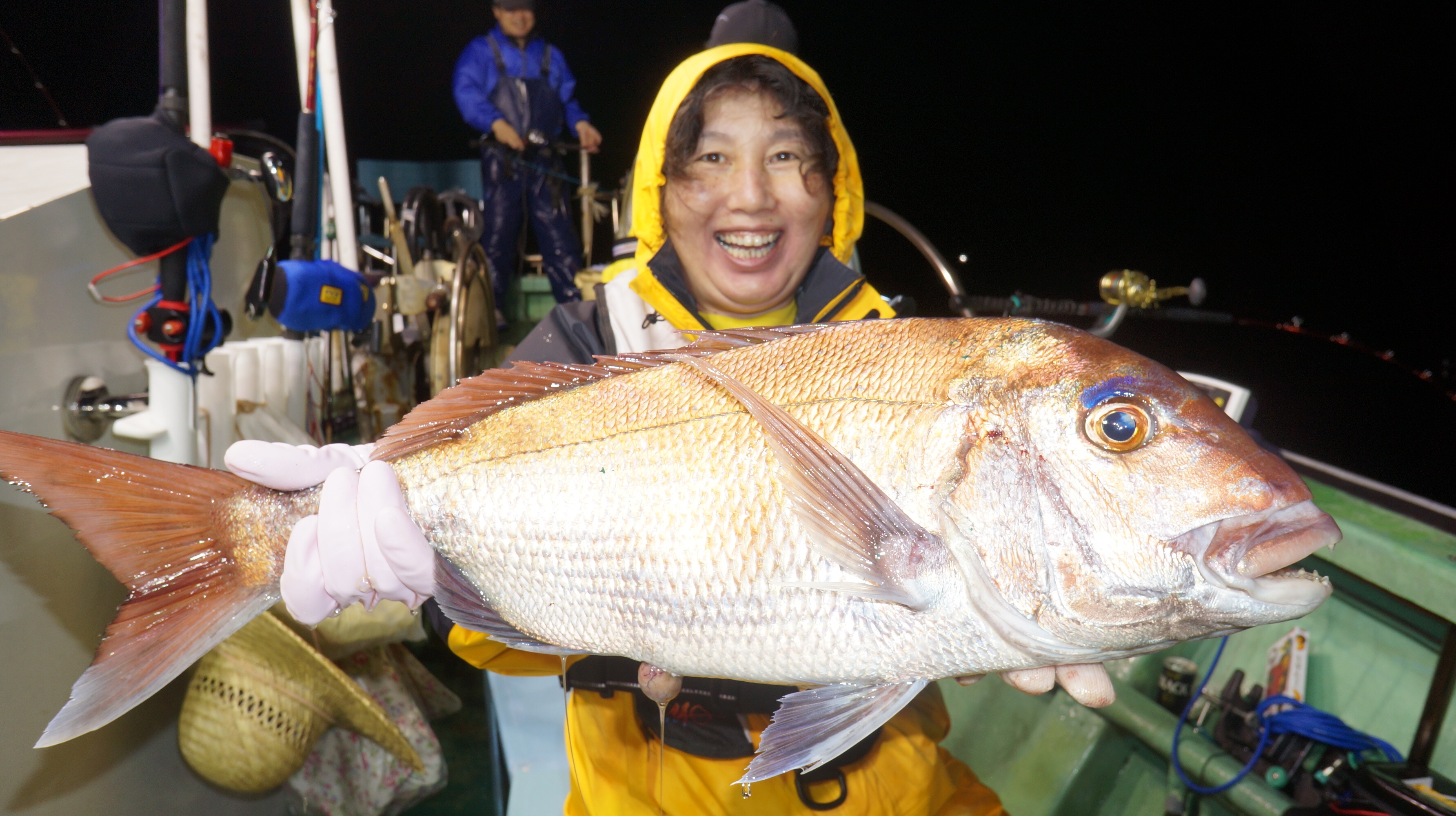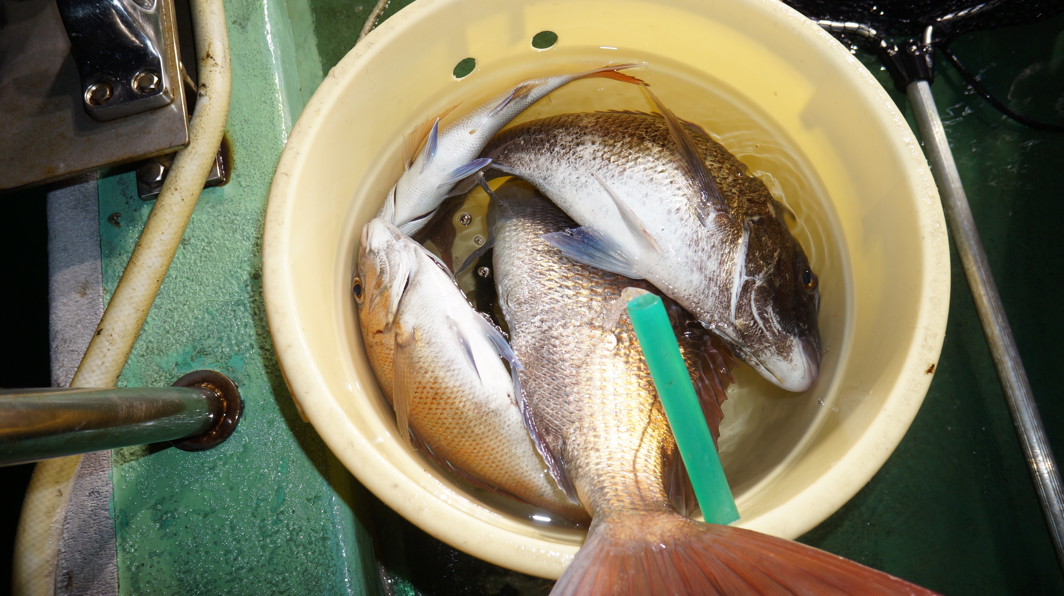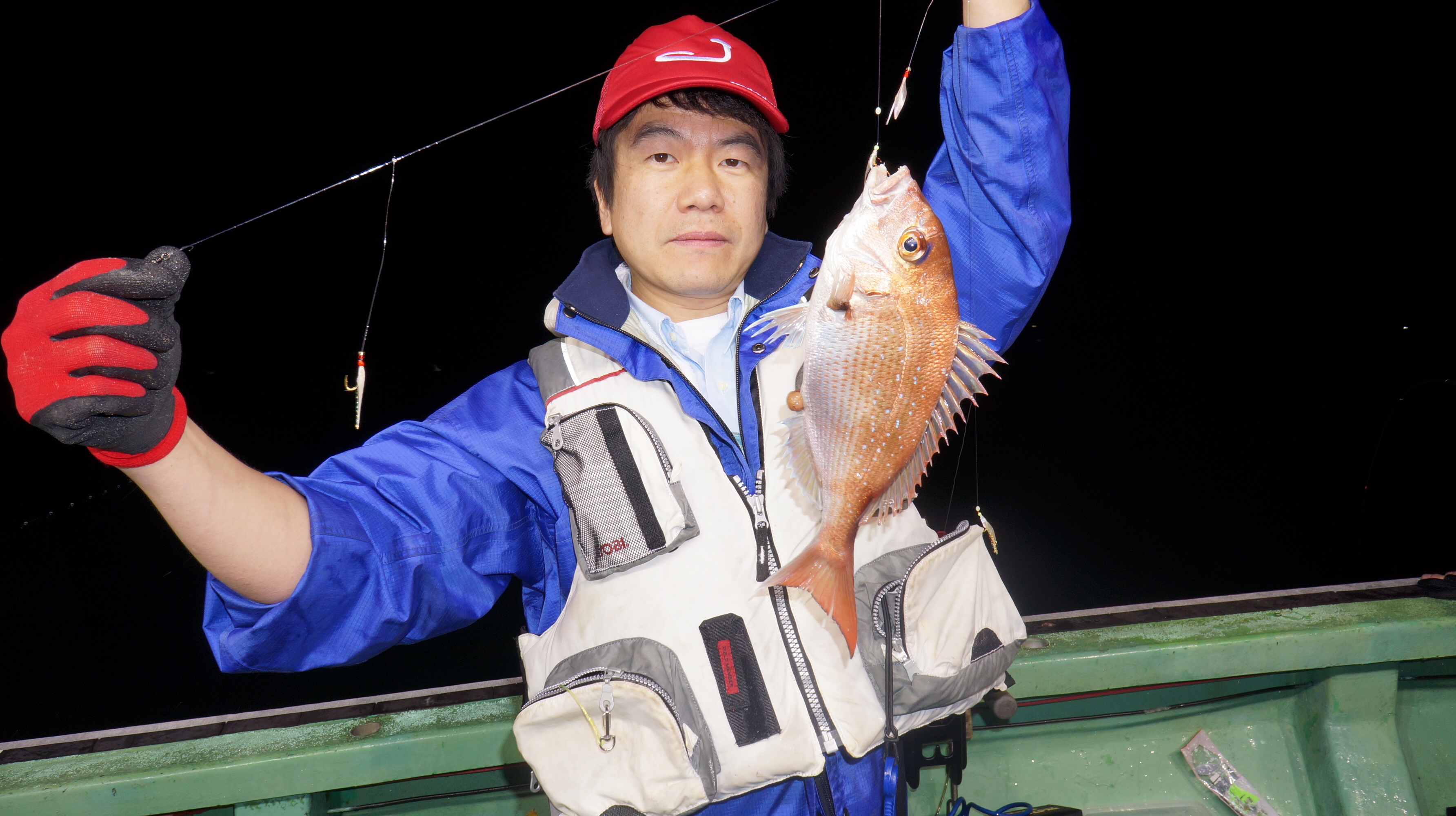 流れ、魚影良くアジ入れ食い、マダイ0.8〜4.8k船中38匹、スズキ3匹.他イナダ