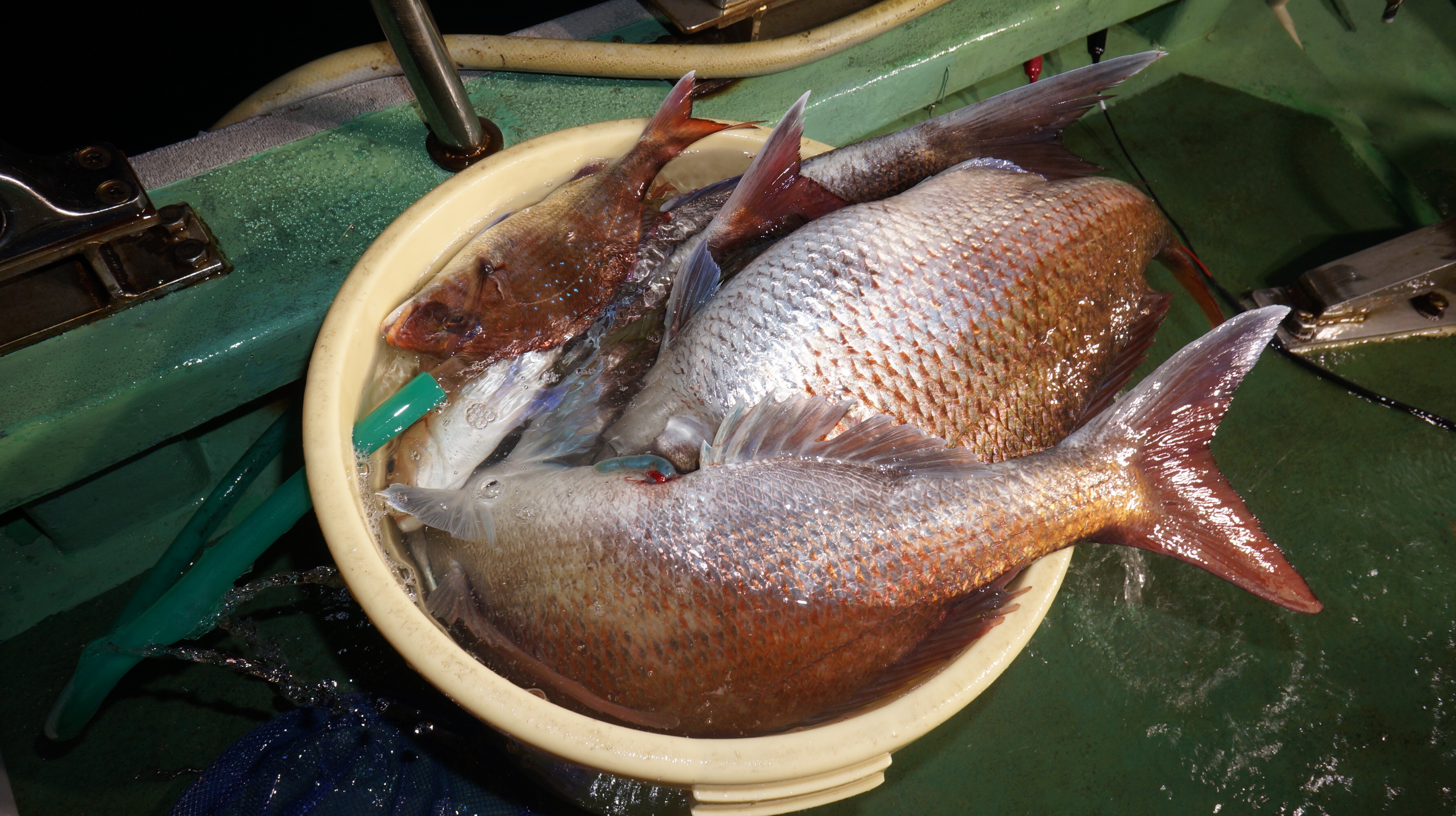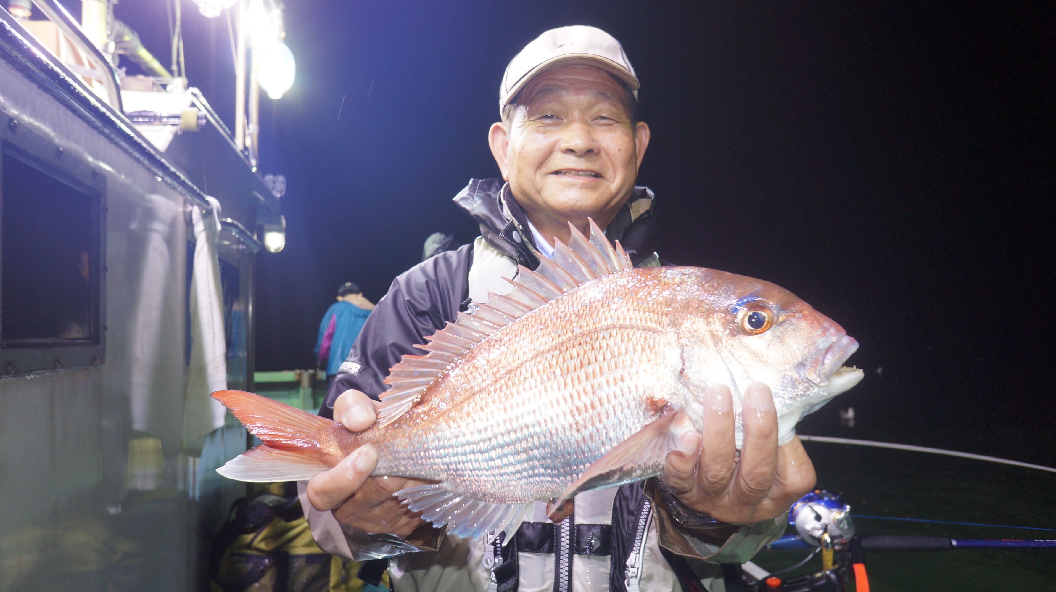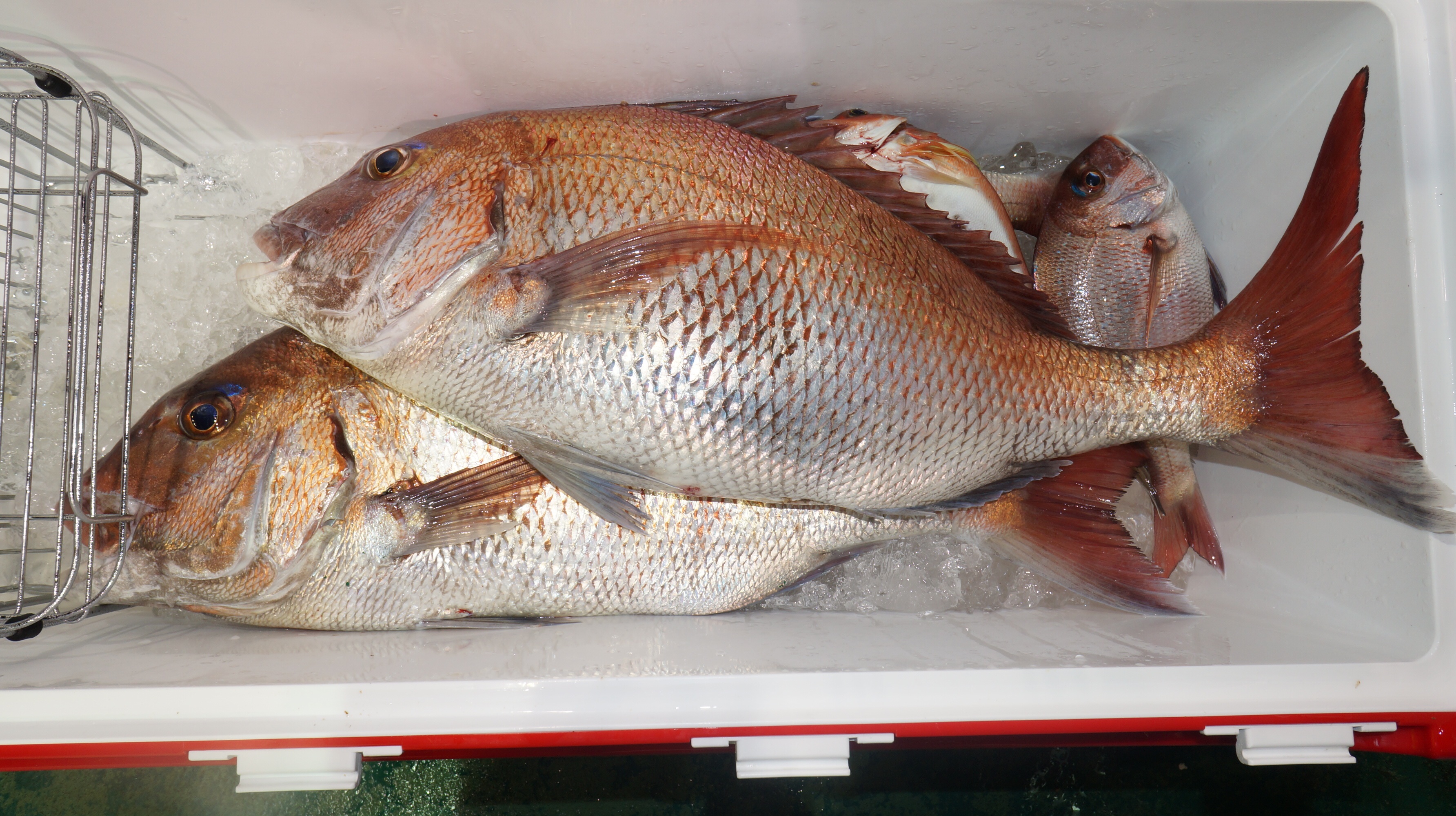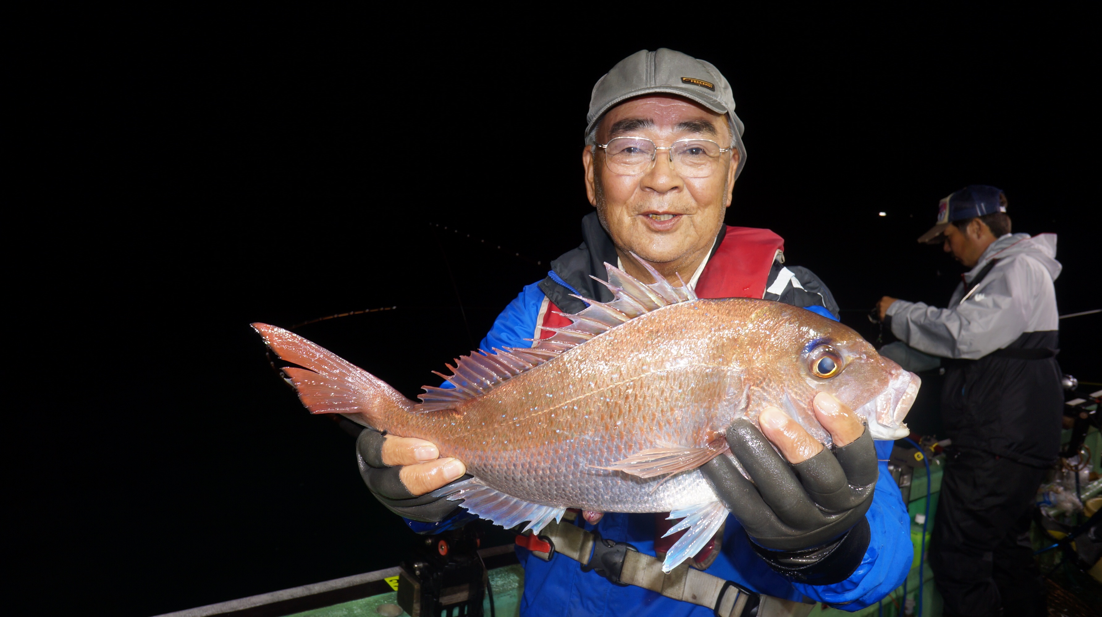 流れ、魚影良くアジ入れ食い、マダイ0.8〜4.8k船中38匹、スズキ3匹.他イナダ