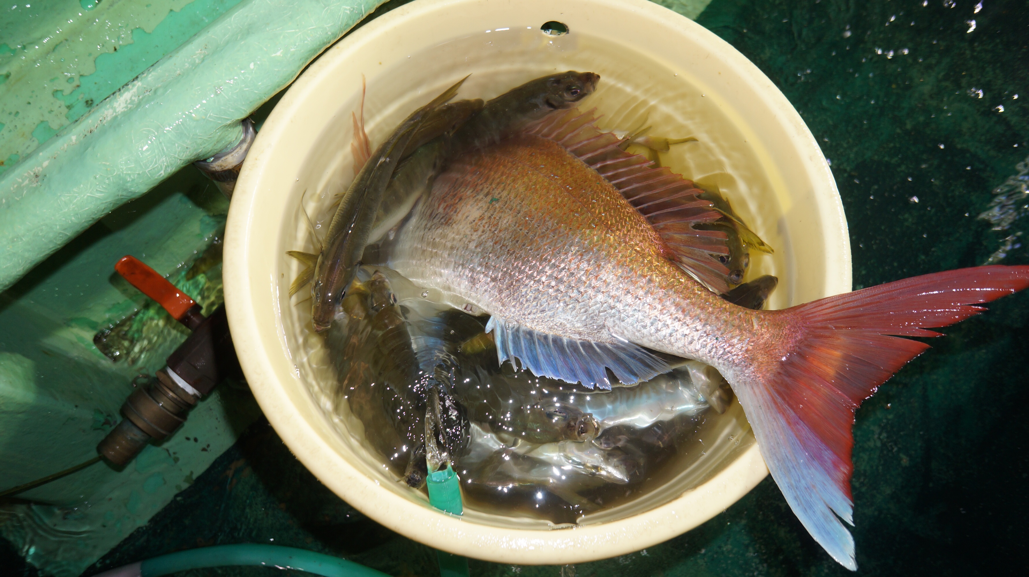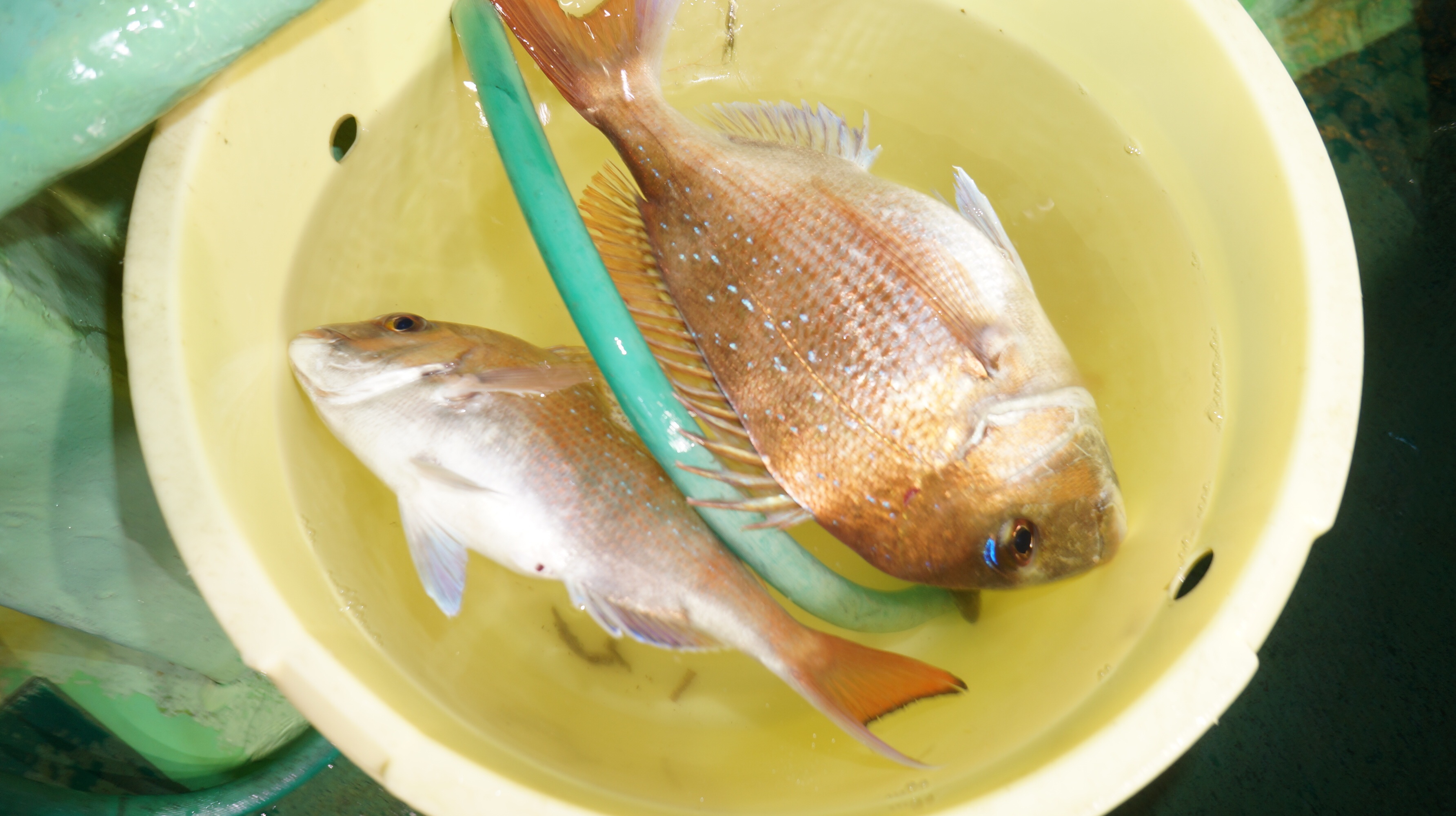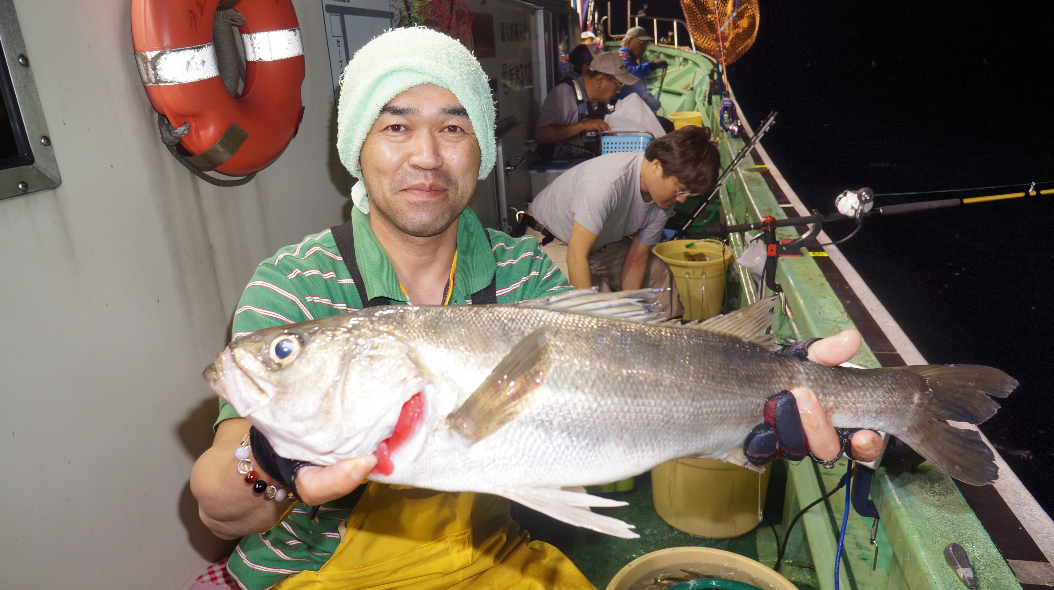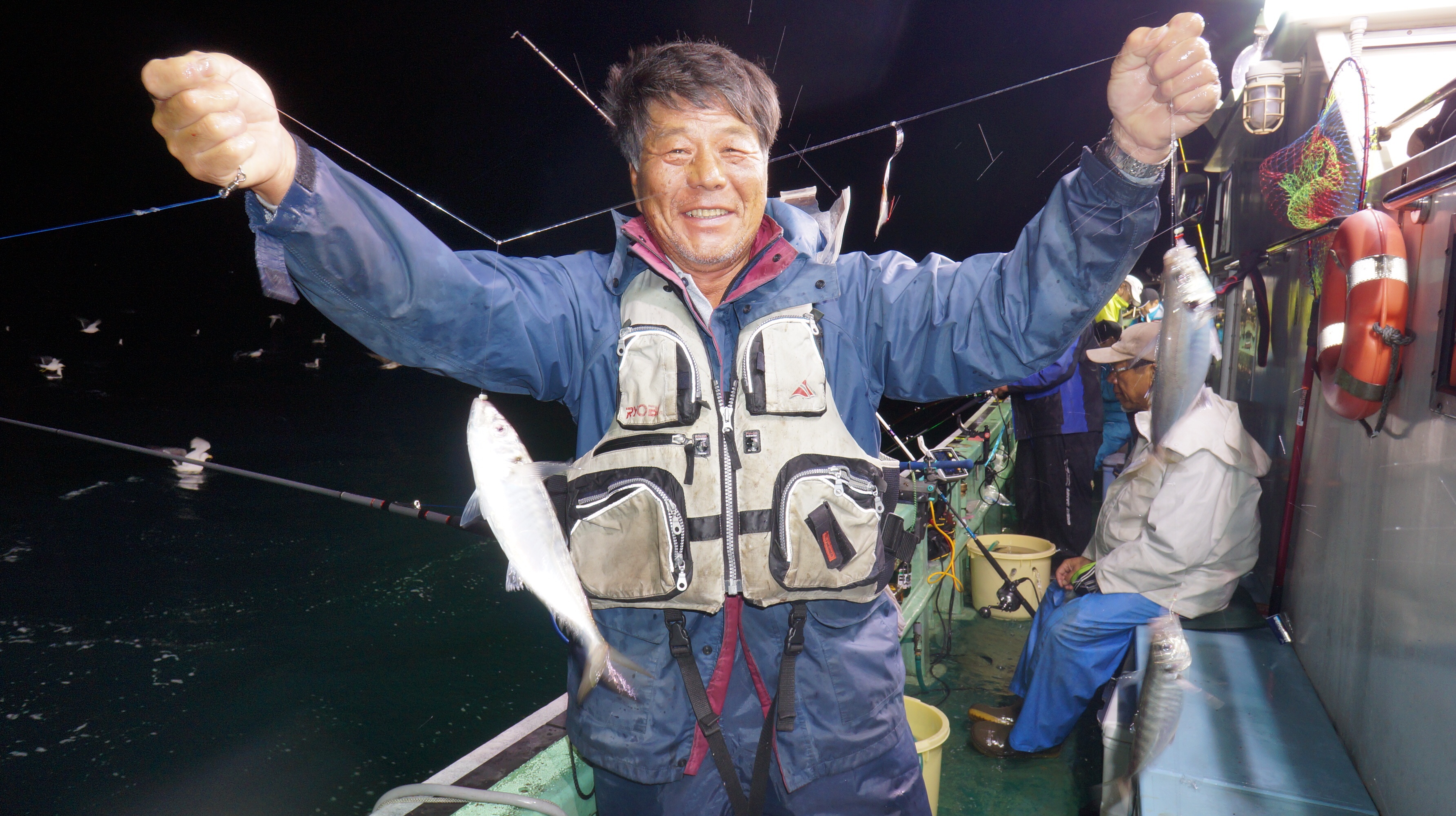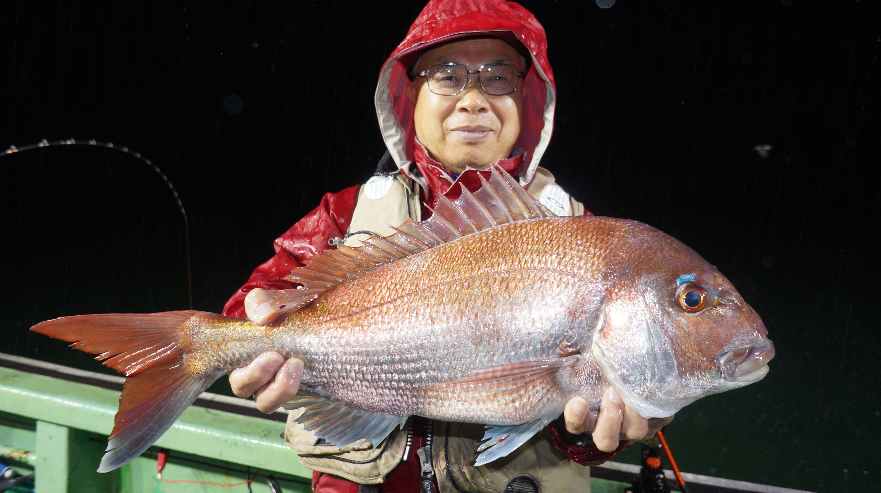 流れ、魚影良くアジ入れ食い、マダイ0.8〜4.8k船中38匹、スズキ3匹.他イナダ