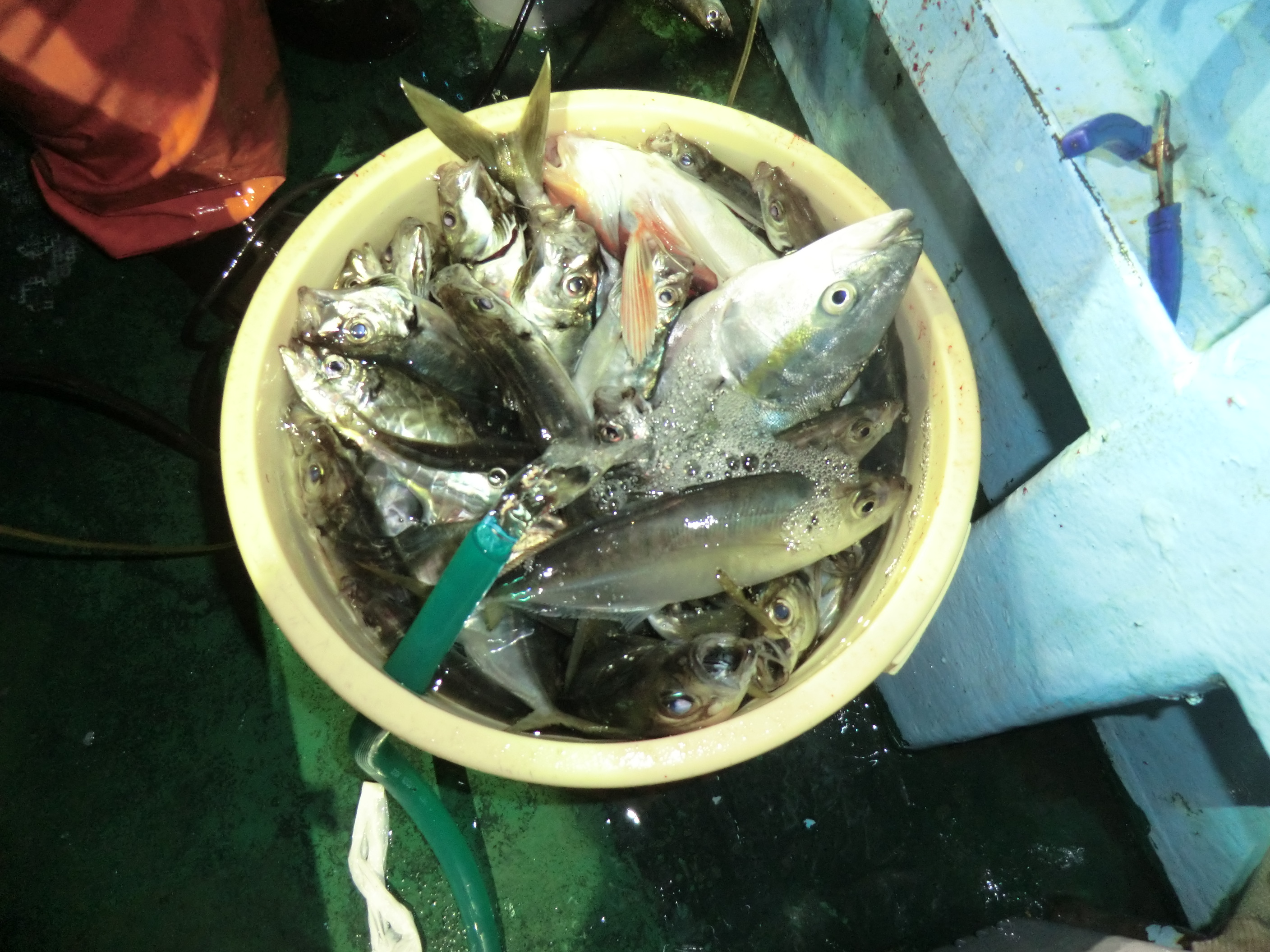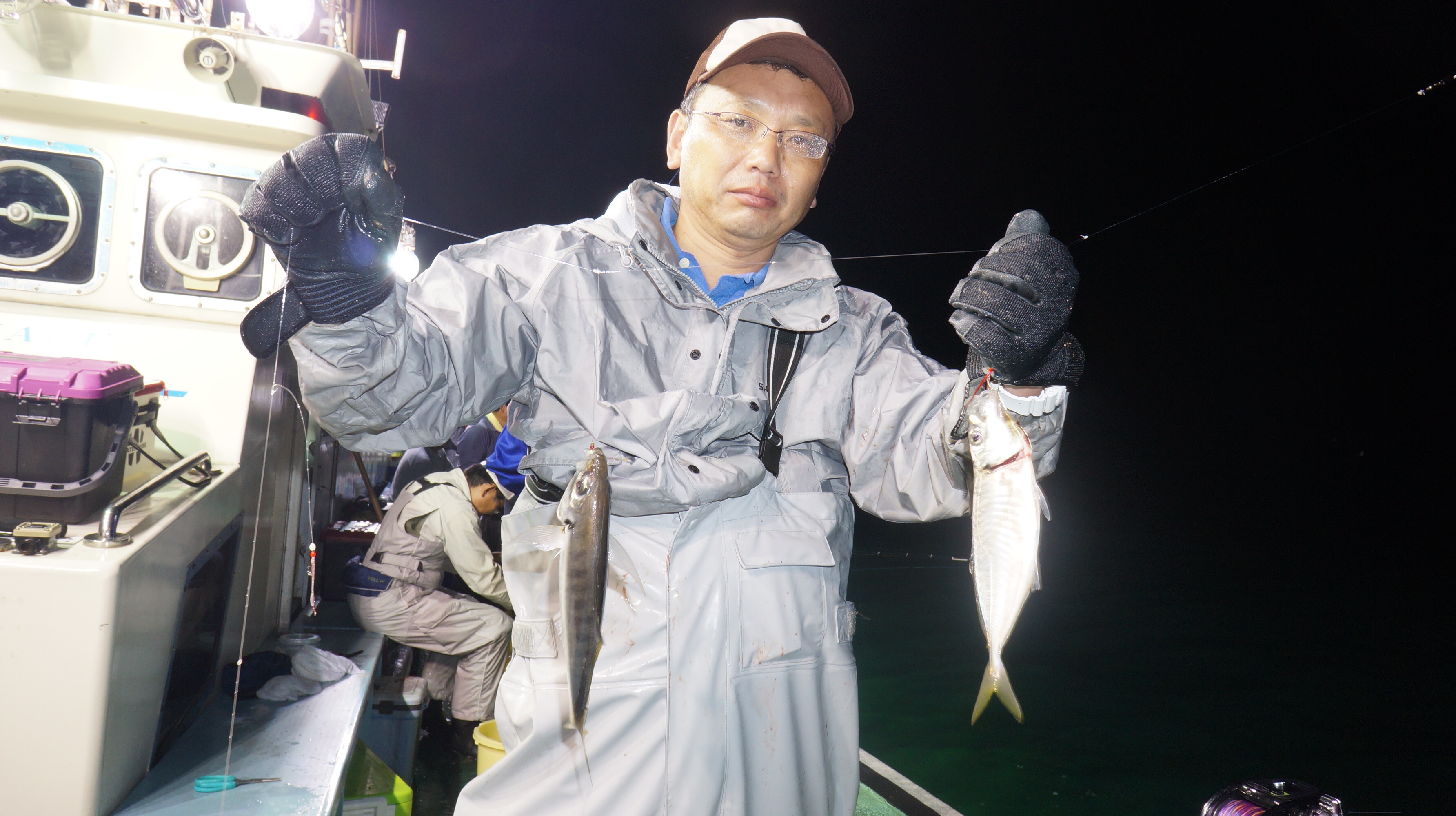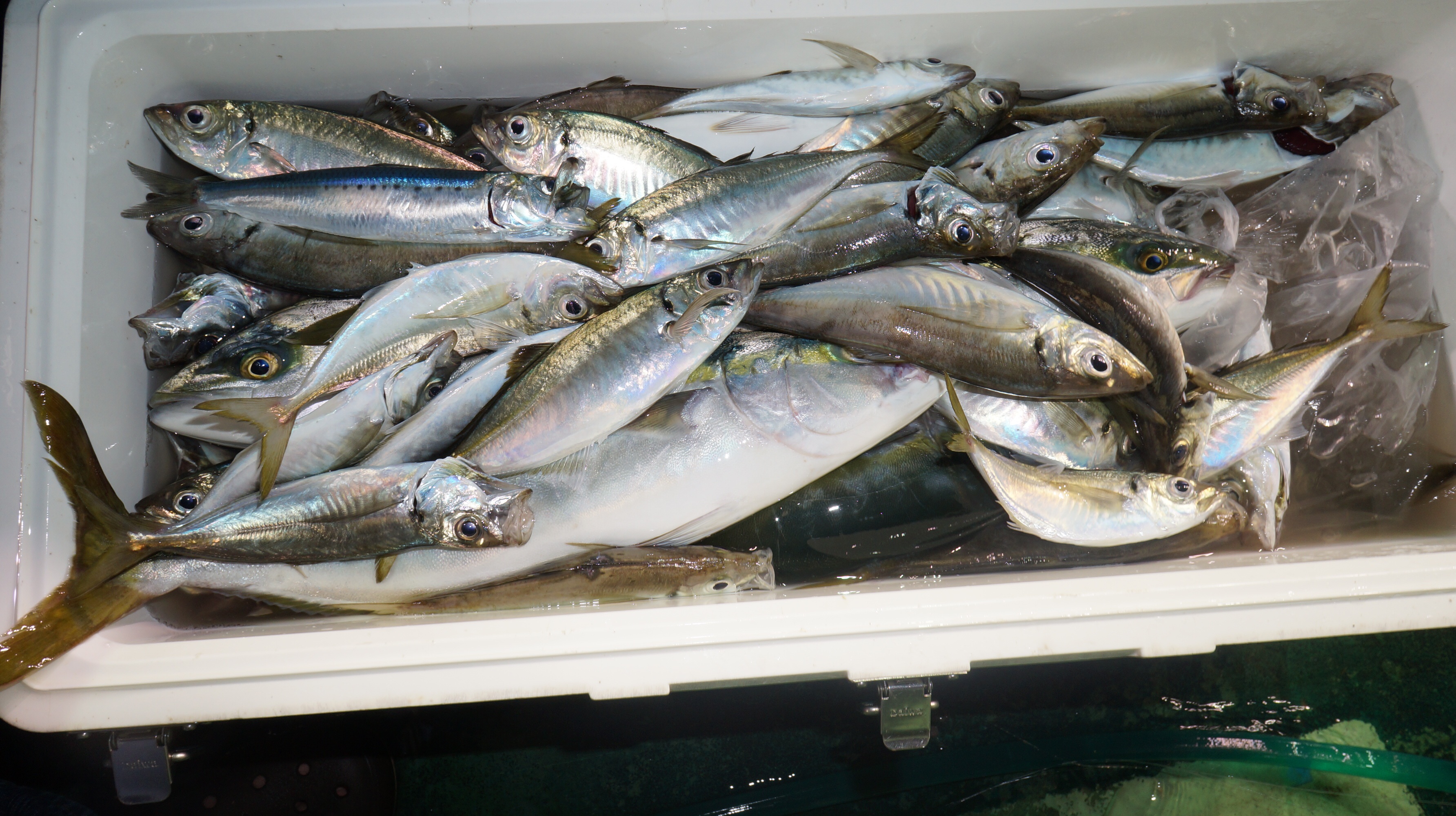 本日雨降りでしたが、海上べた凪、アジ入れ食い大漁、他マダイ、ワラサ、サバ