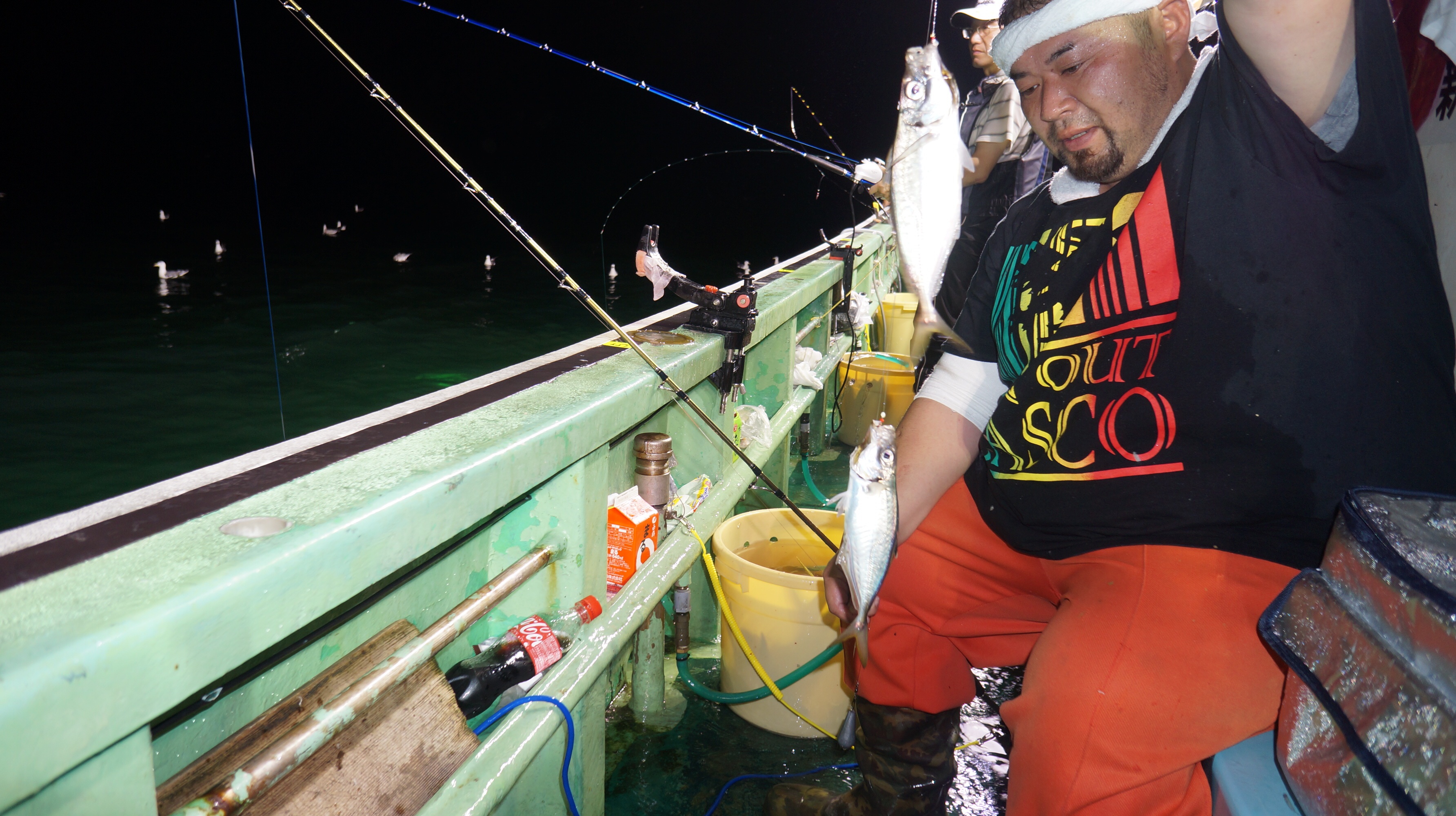 本日貸切、海上穏やか、アジ入れ食い大漁しました。他マダイ、サビキ針に多数匹、イワシ、イナダ、サバ多数匹。