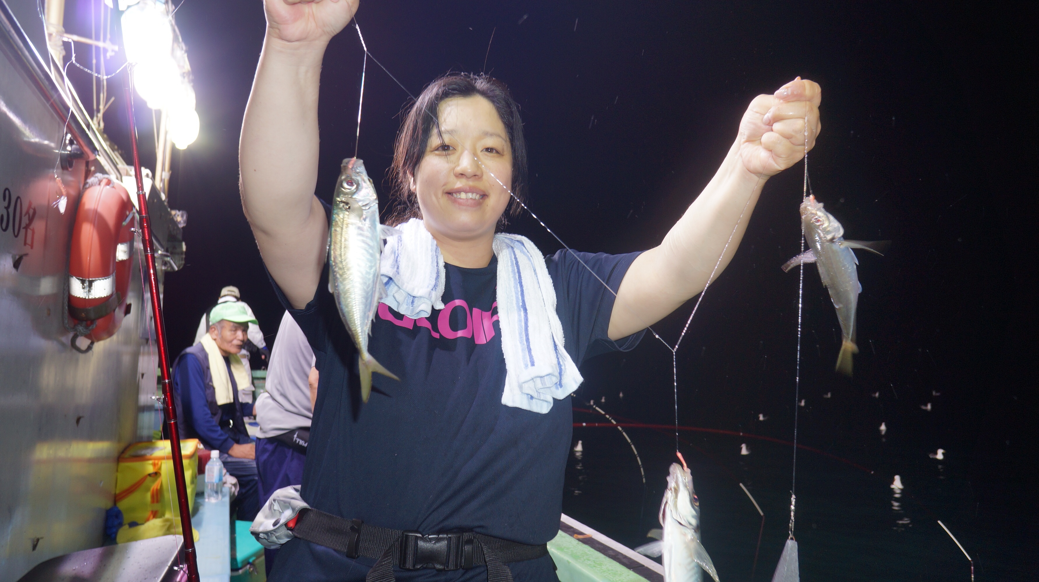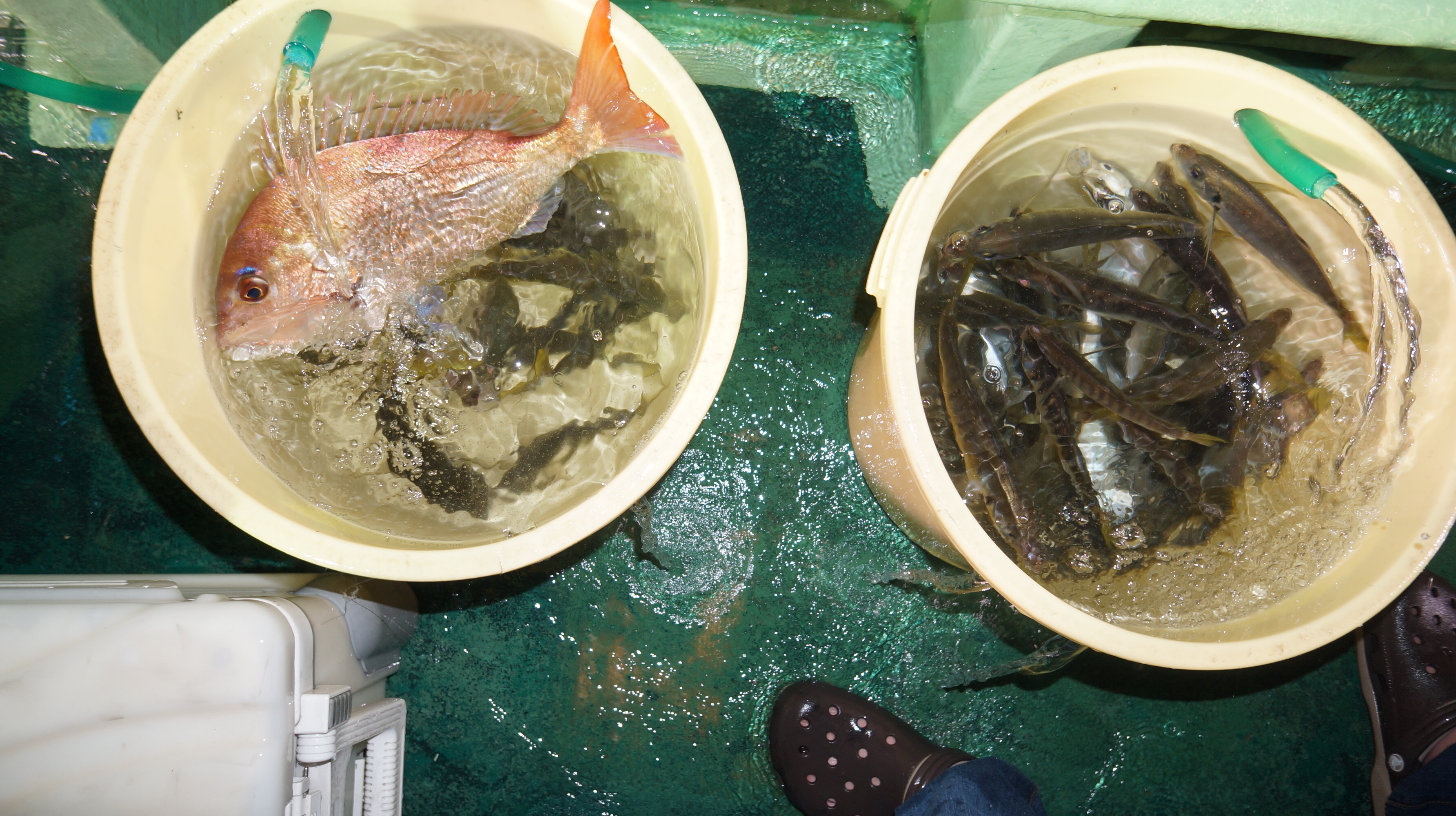 本日海上穏やか、魚影良く中大アジ入れ食い大漁しました、マダイ、サビキ針に良く釣れました、他サバ、ワタリカニ。御予約お待ちしております。